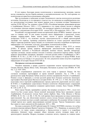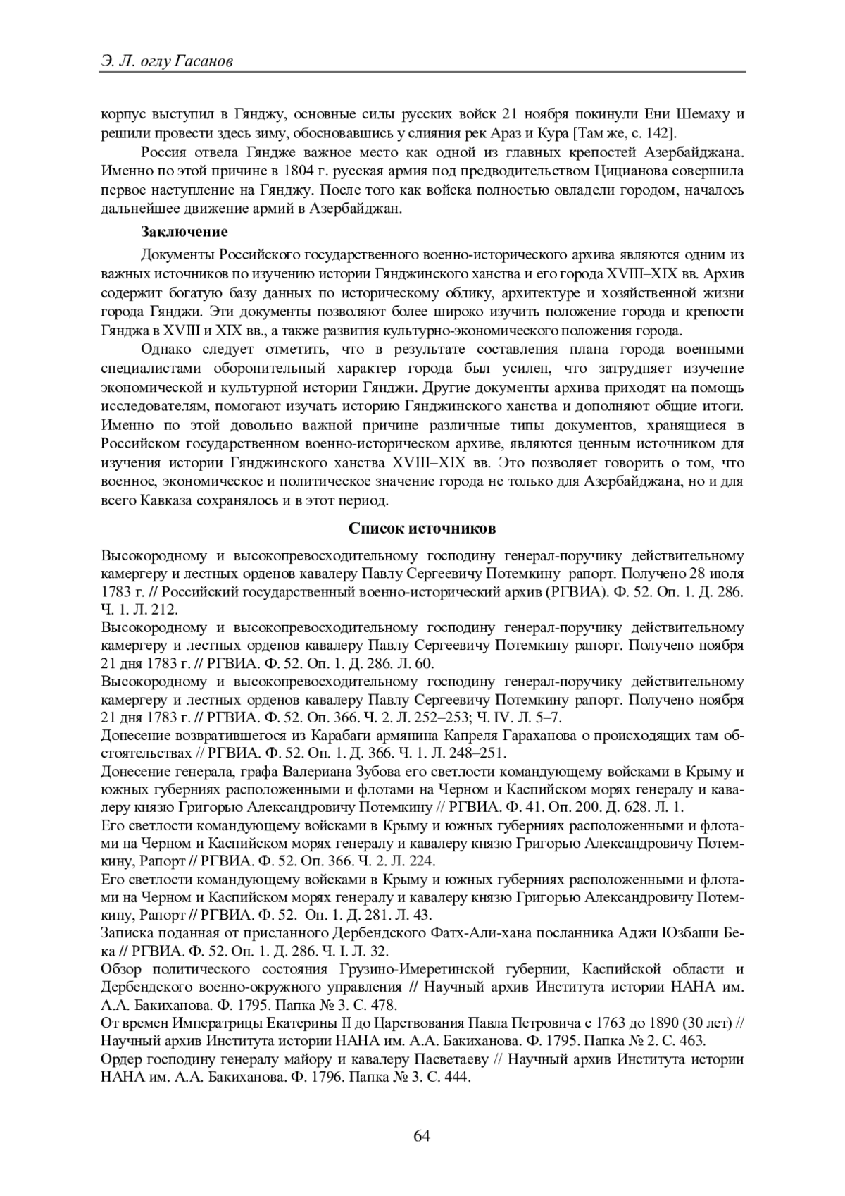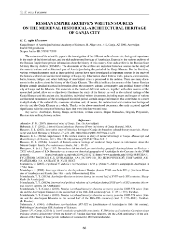 Целью данного исследования является анализ отдельных архивных материалов, имеющих большое значение в изучении исторического прошлого, а также богатого архитектурного наследия Азербайджана. Разные архивы Российской империи содержат довольно значимые сведения об истории этой страны. Один из таких - Российский государственный военно- исторический архив (РГВИА). Его документы являются важными историческими источниками в изучении материальной культуры и архитектурного прошлого Азербайджана периода Гянджинского ханства. Они были привлечены к исследованию историко-культурного наследия, в том числе строительной отрасли, города Гянджи в качестве довольно значимых ресурсов. В архиве сохранились сведения о крепостных стенах, дворцах, караван-сараях, банях, домах, мостах и других постройках азербайджанских городов; имеется множество документов об истории Гянджинского ханства. Официальные военные документы бывшей Российской империи содержат подробные исторические сведения об экономике, культуре, демографии и политической истории Гянджинского ханства и города Гянджи. Материалы фондов Российского государственного военно-исторического архива вместе с другими источниками того периода позволяют уточнить многие аспекты истории культурного наследия Гянджинского ханства и этого древнего города. Кроме того, отдельные письменные документы, в том числе карты, изображения разных архитектурных памятников исследуемого исторического периода содержат в себе уникальные сведения, способствующие более углубленному изучению культурной жизни, экономического состояния и архитектурно-строительного наследия города и Гянджинского ханства в целом. Благодаря вышеуказанным документам исследование приобрело прикладное значение с выявлением малоизвестных до сих пор исторических фактов.