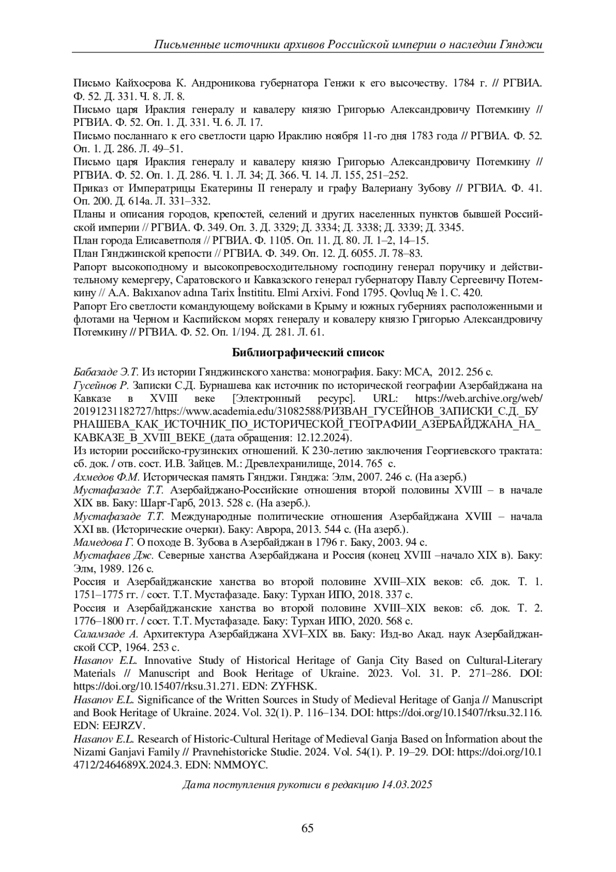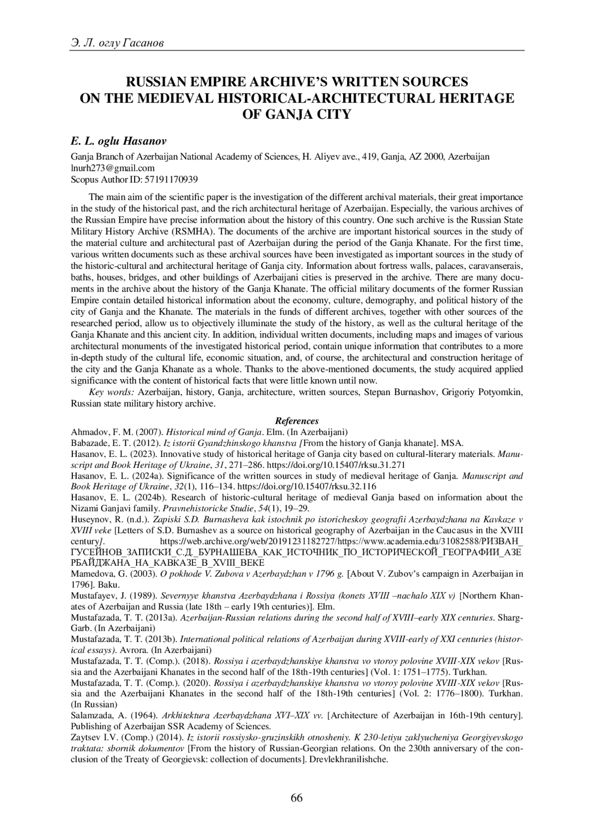 33. Hasanov E.L. Innovative Study of Historical Heritage of Ganja City Based on Cultural-Literary Materials // Manuscript and Book Heritage of Ukraine. 2023. Vol. 31. P. 271-286. DOI: 10.15407/rksu.31.271 EDN: ZYFHSK