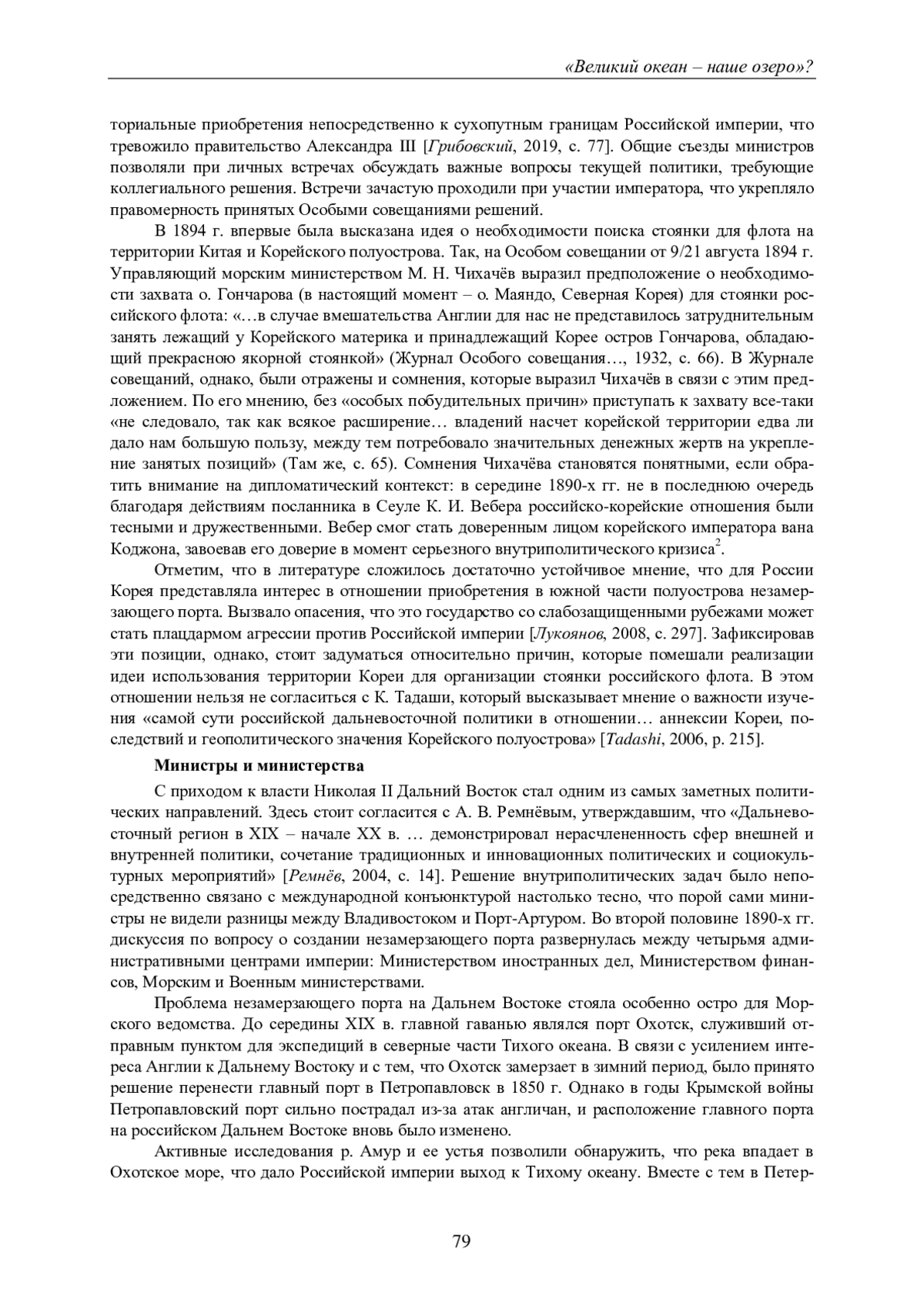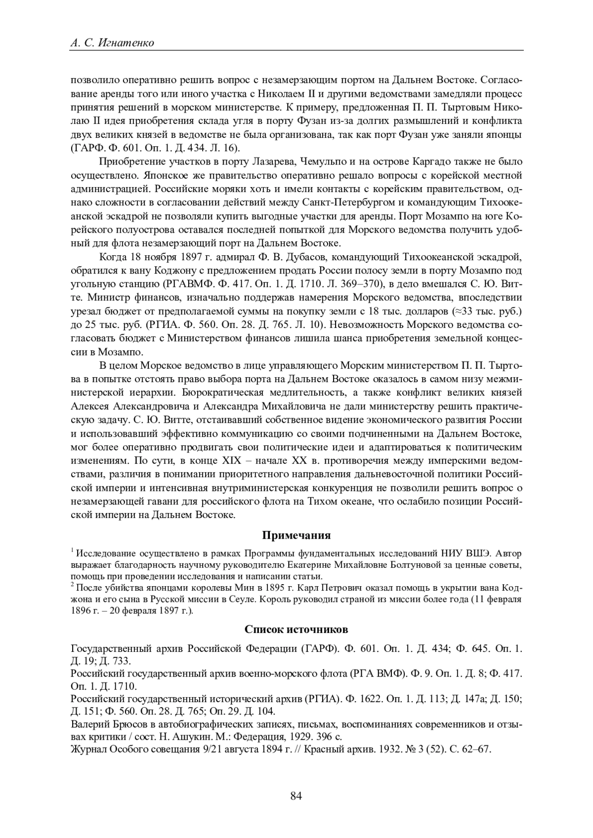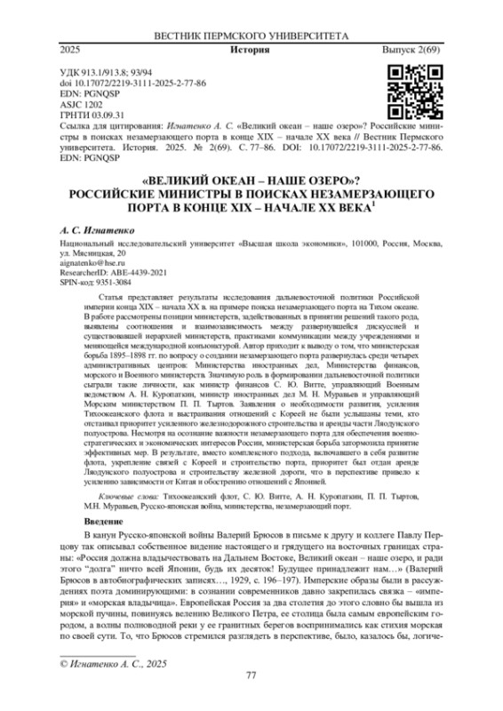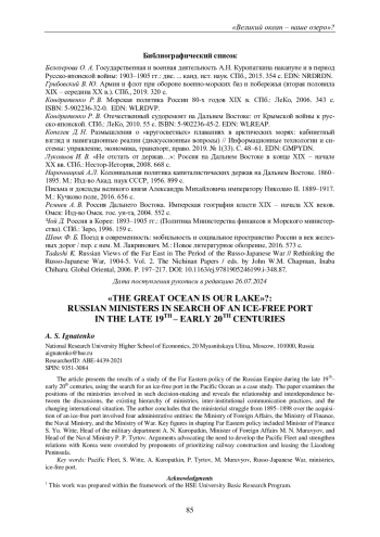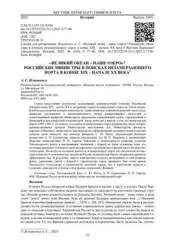 Статья представляет результаты исследования дальневосточной политики Российской империи конца XIX - начала XX в. на примере поиска незамерзающего порта на Тихом океане. В работе рассмотрены позиции министерств, задействованных в принятии решений такого рода, выявлены соотношения и взаимозависимость между развернувшейся дискуссией и существовавшей иерархией министерств, практиками коммуникации между учреждениями и меняющейся международной конъюнктурой. Автор приходит к выводу о том, что министерская борьба 1895-1898 гг. по вопросу о создании незамерзающего порта развернулась среди четырех административных центров: Министерства иностранных дел, Министерства финансов, морского и Военного министерств. Значимую роль в формировании дальневосточной политики сыграли такие личности, как министр финансов С. Ю. Витте, управляющий Военным ведомством А. Н. Куропаткин, министр иностранных дел М. Н. Муравьев и управляющий Морским министерством П. П. Тыртов. Заявления о необходимости развития, усиления Тихоокеанского флота и выстраивания отношений с Кореей не были услышаны теми, кто отстаивал приоритет усиленного железнодорожного строительства и аренды части Ляодунского полуострова. Несмотря на осознание важности незамерзающего порта для обеспечения военно- стратегических и экономических интересов России, министерская борьба затормозила принятие эффективных мер. В результате, вместо комплексного подхода, включавшего в себя развитие флота, укрепление связей с Кореей и строительство порта, приоритет был отдан аренде Ляодунского полуострова и строительству железной дороги, что в перспективе привело к усилению зависимости от Китая и обострению отношений с Японией.