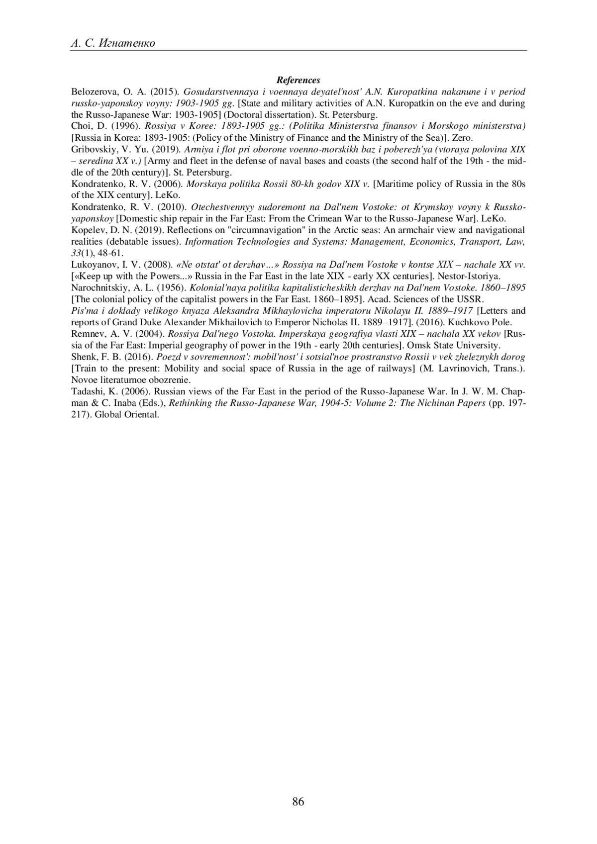 8. 	Кондратенко Р. В. Морская политика России 80-х годов XIX в. СПб.: ЛеКо, 2006. 343 с. ISBN: 5-902236-32-0 EDN: WLRDVP