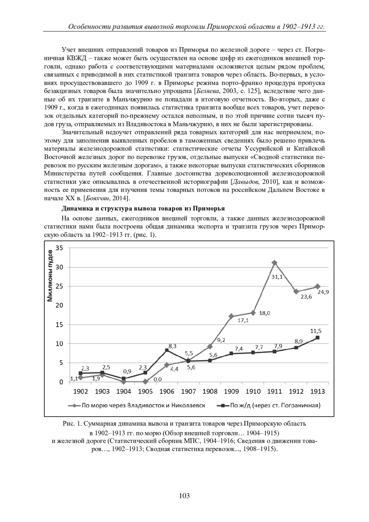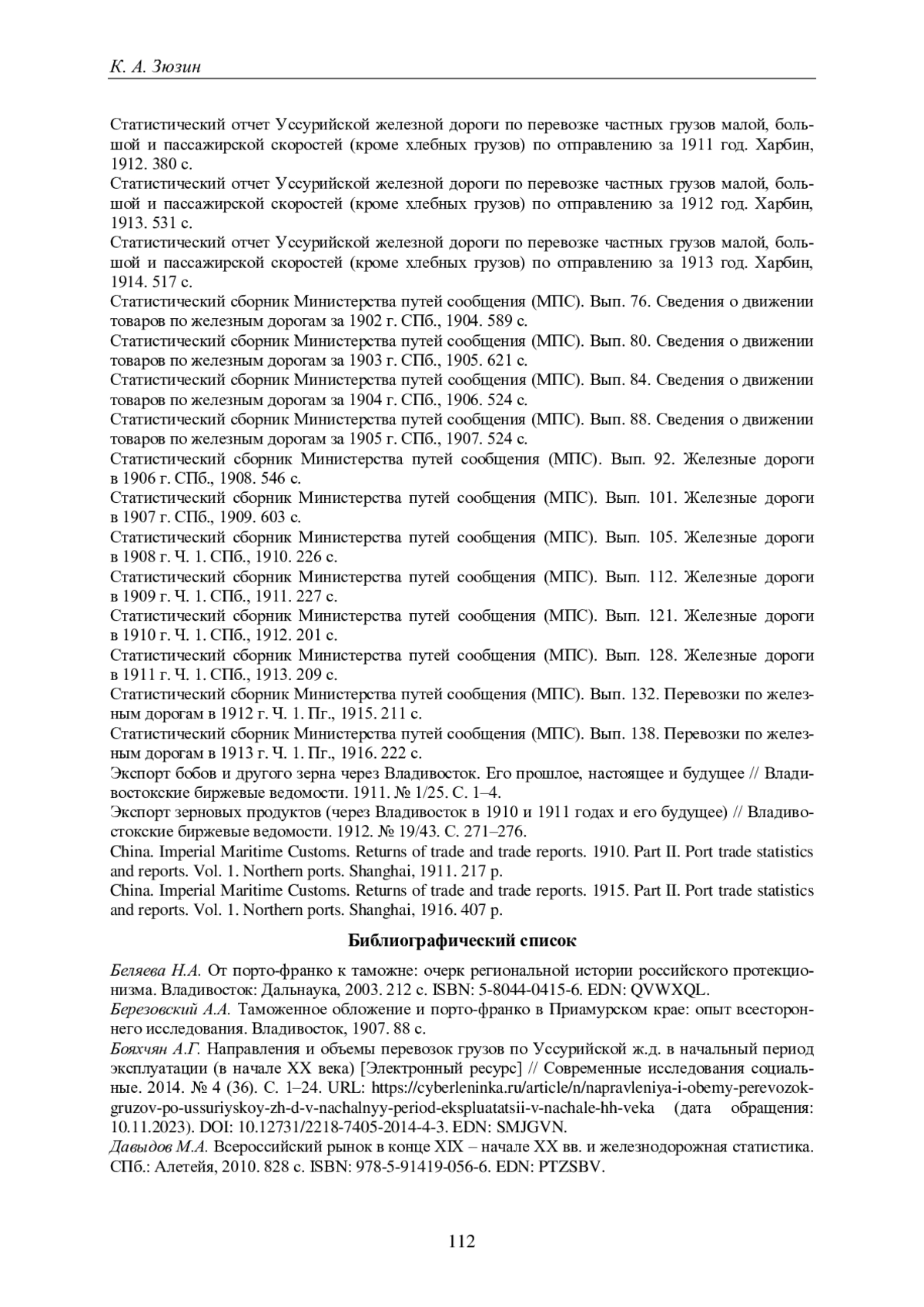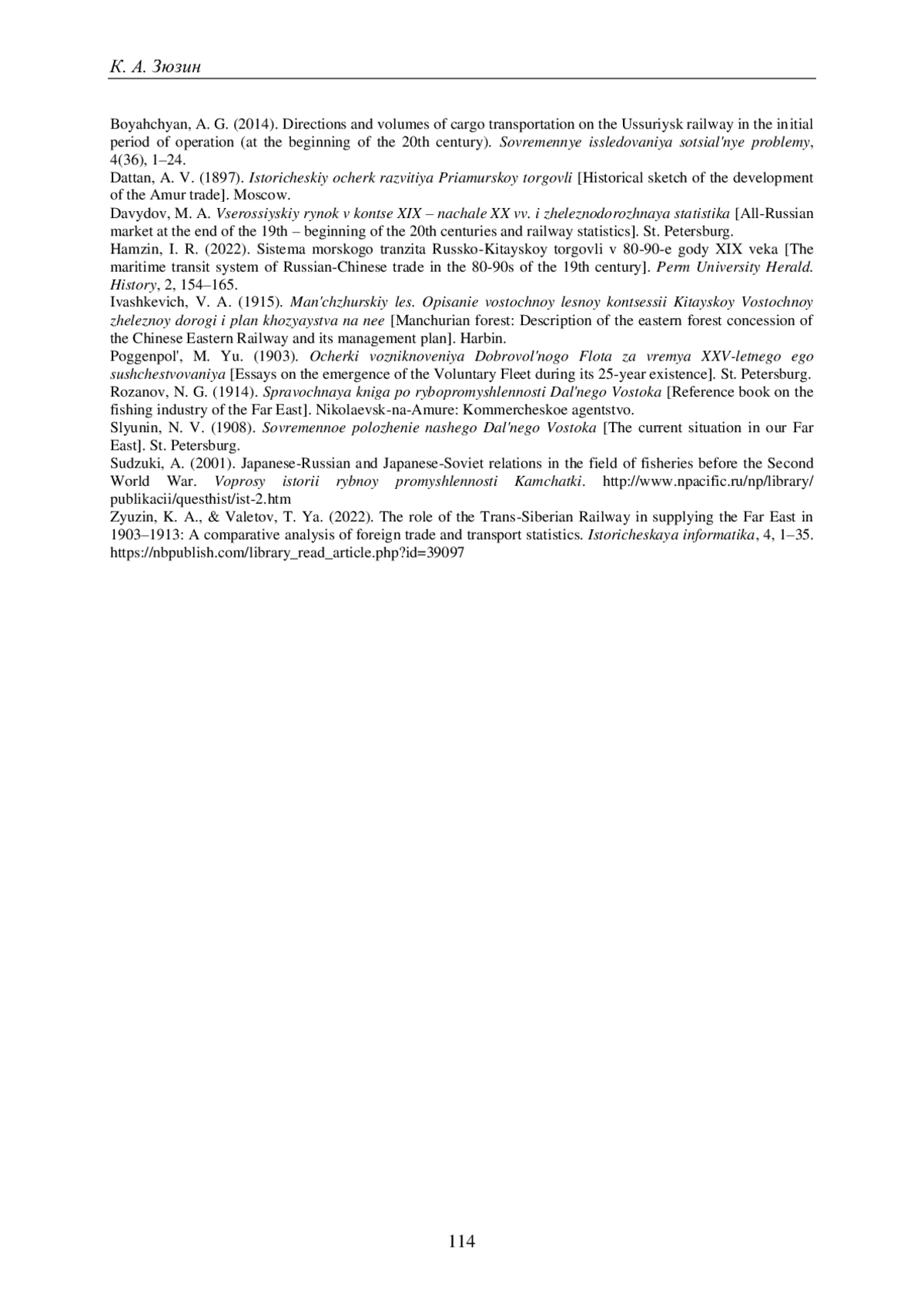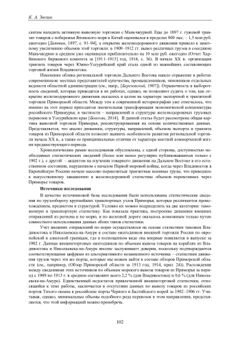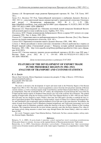 60. Зюзин К.А., Валетов Т.Я. Роль Транссибирской магистрали в снабжении Дальнего Востока в 1903-1913 гг.: сопоставительный анализ внешнеторговой и транспортной статистики [Электронный ресурс] // Историческая информатика. 2022. № 4. С. 1-35. URL: https://nbpublish.com/library_read_article.php?id=39097 (дата обращения: 01.10.2023). DOI: 10.7256/2585-7797.2022.4.39097 EDN: EBBFWX