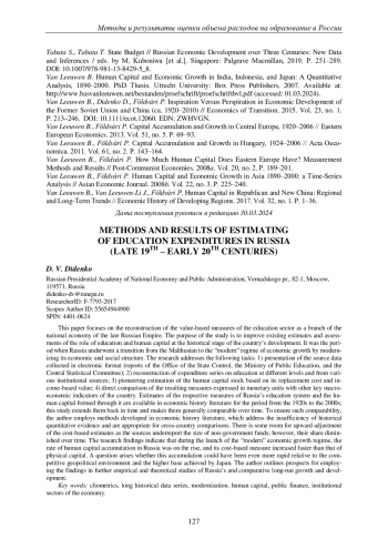35. Didenko D., Földvári P., Van Leeuwen B. The Spread of Human Capital in the Former Soviet Union Area in a Comparative Perspective: Exploring a New Dataset // Journal of Eurasian Studies. 2013. Vol. 4, no. 2. P. 123-135. Available at: https://www.sciencedirect.com/science/article/pii/S1879366513000122 (accessed: 01.03.2024). DOI: 10.1016/j.euras.2013.03.002 EDN: RFHDWF
