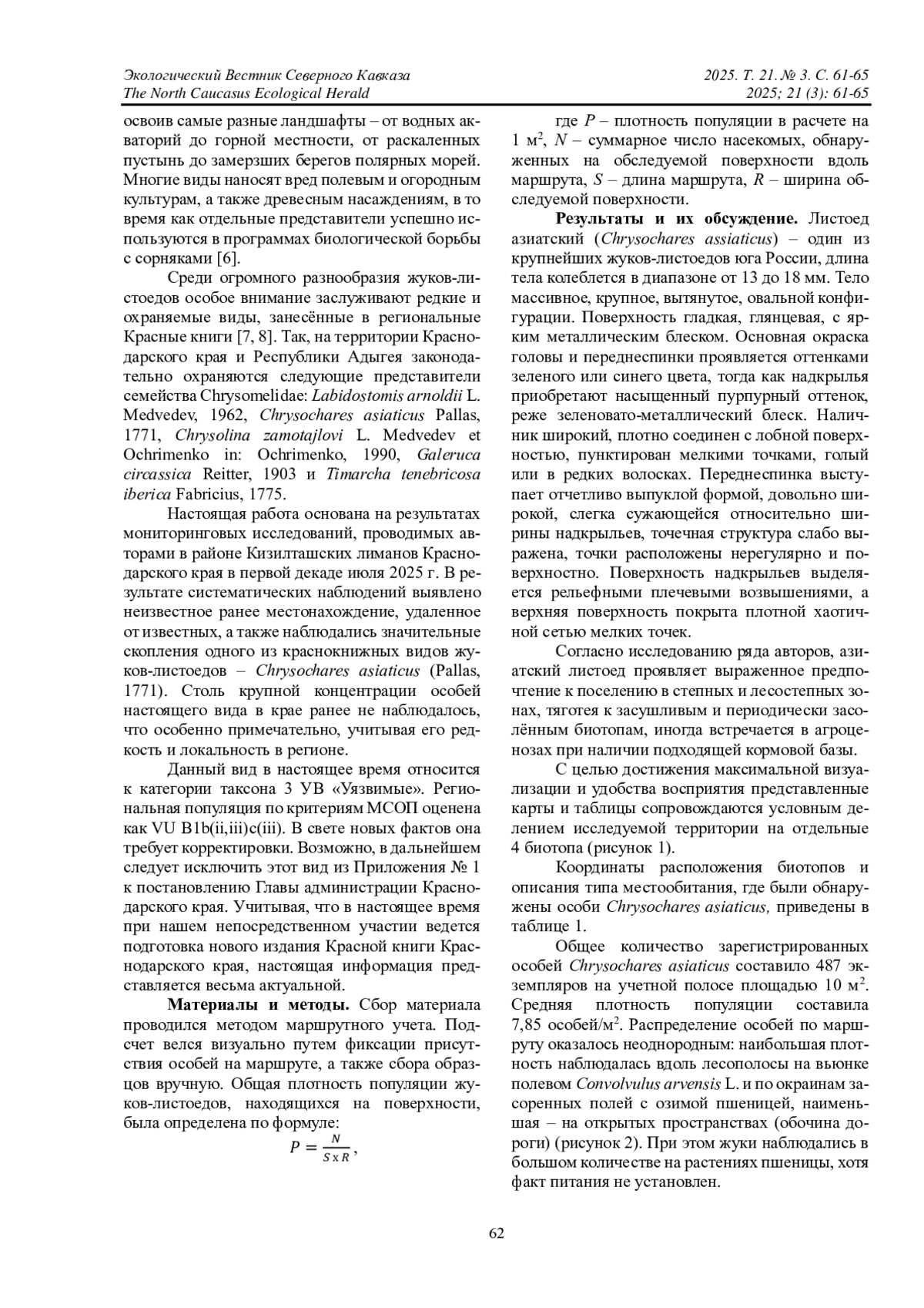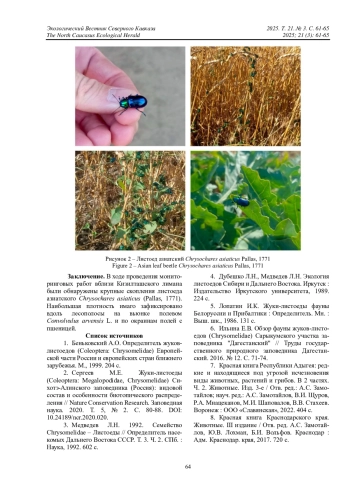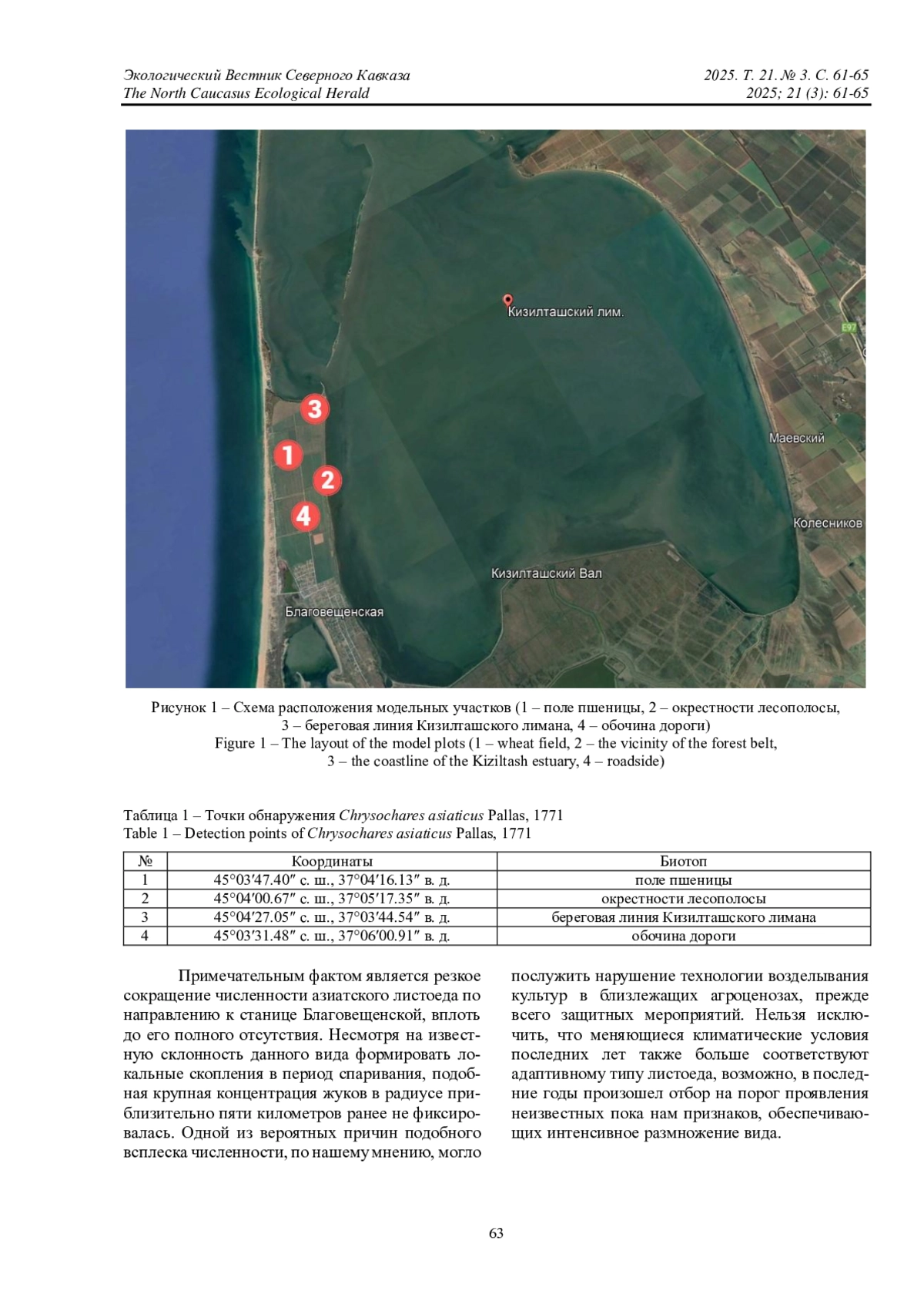 В статье приведены сведения о впервые наблюдающихся в регионе больших скоплениях листоеда азиатского Chrysochares asiaticus (Pallas, 1771) в окрестностях Кизилташского лимана Краснодарского края. Представлен подробный анализ указанного явления, направленный на комплексное изучение ключевых характеристик и причин его появления.