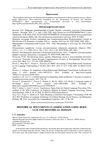 1. 	Володин А.Ю. Цифровая трансформация истории? Данные, стандарты, подходы [Электронный ресурс] // История. 2020. T. 11, вып. 3 (89). URL: https://history.jes.su/s207987840009746-9-1/ (дата обращения: 10.08.2024). Электронная библиотека исторических документов (проект РИО): http://docs.historyrussia.org/ru/nodes/1-glavnaya. DOI: 10.18254/S207987840009746- EDN: JLAZBU