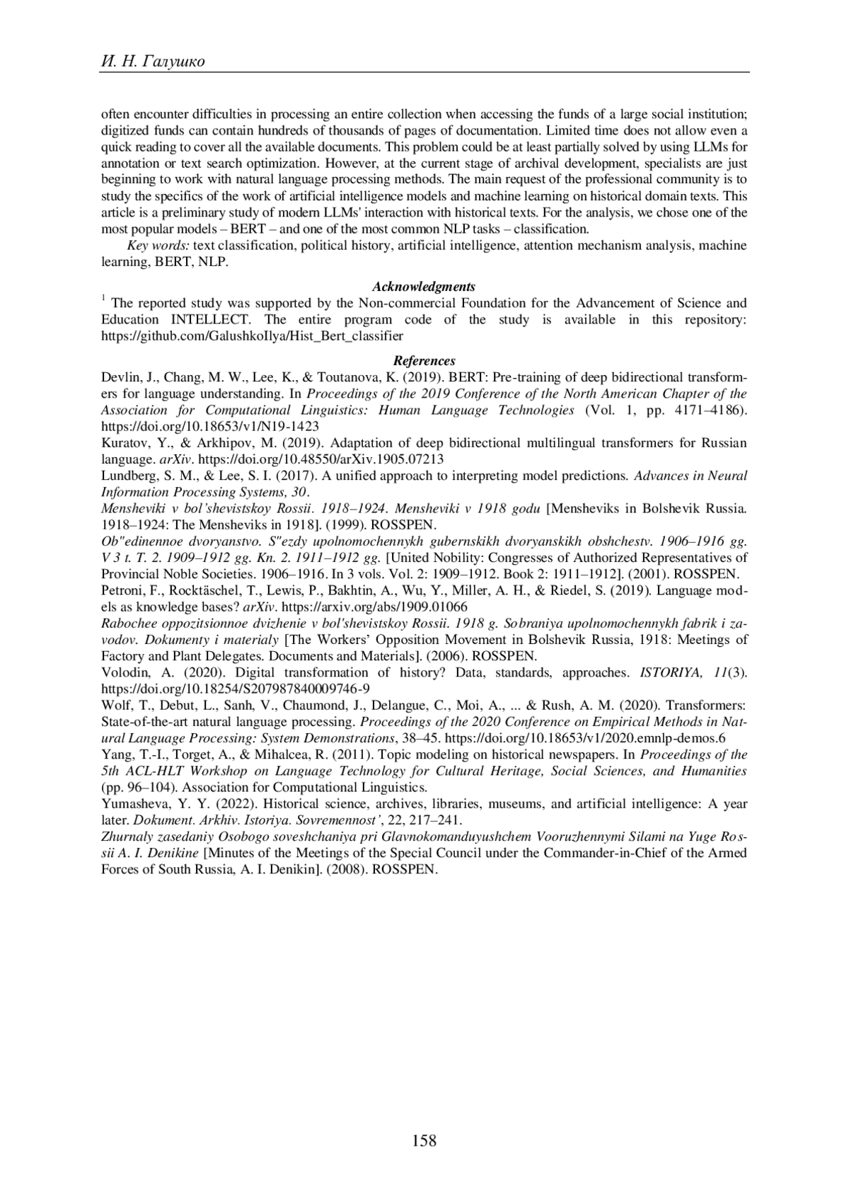 7. 	Devlin J., Ming-Wei C., Kenton L., Toutanova K. BERT: Pre-training of Deep Bidirectional Transformers for Language Understanding // NAACL-HLT 2019. 2019. Р. 4171-4186. DOI: 10.18653/v1/N19-1423