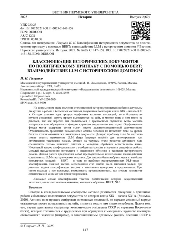 На современном этапе изучения отечественной истории становятся особенно актуальны дискуссии о работе с большими массивами документов по истории конца XIX - начала XXI в. Сегодня активно идет процесс оцифровки архивных коллекций, но в большинстве случаев созданный корпус просто выставляется на сайт, и многие годы с ним никто не работает, так как нередко мы сталкиваемся с трудностями обработки всего массива материалов при обращении к фондам крупного социального института. Оцифрованные фонды могут содержать сотни тысяч листов делопроизводственной документации. Ограниченность временных возможностей одного человека не позволяет даже на уровне беглого чтения охватить все имеющиеся документы. Данную проблему хотя бы частично может решить применение LLM (large language models) для аннотирования или оптимизации текстового поиска. Однако на текущем этапе развития архивного дела специалисты только начинают работать с методами обработки естественного языка. И основной запрос профессионального сообщества состоит в изучении специфики работы моделей искусственного интеллекта и машинного обучения с текстами исторического домена. Данная работа представляет собой предварительное исследование взаимодействия современных LLM с историческими текстами. Для анализа были выбраны одна из наиболее популярных моделей - BERT - и одна из наиболее распространенных NLP-задач - классификация. Важной частью исследования стал анализ весов внимания модели при решении задачи классификации текстов и заполнения пропусков в предложениях. При таком подходе у нас появилась возможность проанализировать, как модель использует семантический контекст для принятия решения.