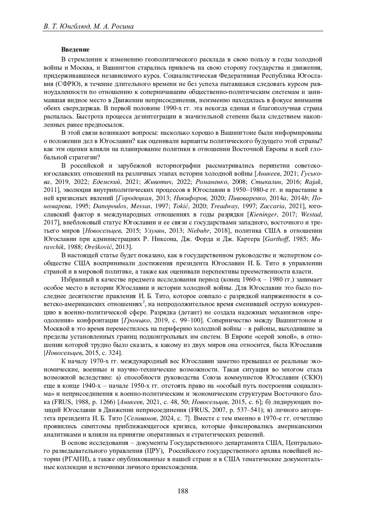 Статья посвящена американо-югославским отношениям в 1969-1980 гг. В центре исследования - восприятие в Вашингтоне личных и политических качеств И. Б. Тито, оставившего глубокий след в истории Югославии и международных отношений. Показано, что политический выбор этого политика в пользу дистанцирования от СССР и стран Варшавского договора, его независимая внеблоковая стратегия и особая роль в создании и развитии Движения неприсоединения учитывались при решении администраций Р. Никсона, Дж. Форда и Дж. Картера пойти на сближение с СФРЮ. Развитие американо-югославских связей было важным элементом стратегии США. Отмечается, что в государственном руководстве и экспертном сообществе США высоко оценивали достижения Тито в управлении страной. В течение всего десятилетия в Вашингтоне существенное внимание уделяли проблеме преемственности власти, поскольку от этого зависели перспективы сохранения территориальной целостности и государственного суверенитета Югославии. Статья написана на основе широкого круга российских и американских документов и опирается на достижения современной историографии. Эмпирический материал препарируется методами историко- динамического анализа. Первоочередное внимание уделено оцениванию американскими аналитическими службами (Государственный департамент, СНБ, ЦРУ) перспектив сохранения наследия Тито после его ухода из жизни и влиянию этих оценок на формулирование стратегических задач Вашингтона в отношении этой страны в 1969-1981 гг. Обосновываются выводы о том, что в Соединенных Штатах были осведомлены о реальном положении дел в Югославии и отслеживали развитие политических процессов в этой стране. Эксперты знали об отсутствии адекватного механизма преемственности власти, вытекающих из этого обстоятельства последствиях в виде разрушения федерации и даже возможной гражданской войны и строили свою региональную и глобальную политику с учетом данного обстоятельства.