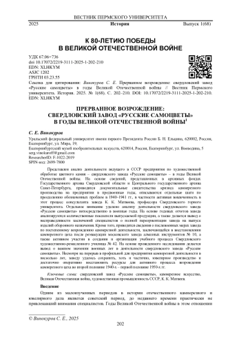 Представлен анализ деятельности ведущего в СССР предприятия по художественной обработке цветного камня - свердловского завода «Русские самоцветы» - в годы Великой Отечественной войны. На основе сведений, представленных в архивных фондах Государственного архива Свердловской области и Центрального государственного архива Санкт-Петербурга, приводятся документальные свидетельства кризиса камнерезного производства на предприятии в предвоенные годы, описываются отдельные шаги по преодолению обозначенных проблем в 1940-1941 гг., в частности активная вовлеченность в этот процесс консультанта завода К. К. Матвеева, профессора Свердловского горного университета. Отдельное внимание уделено анализу деятельности свердловского завода «Русские самоцветы» непосредственно в военные годы. На основе годовых отчетов завода анализируются количественные показатели выпускаемой продукции, а также делается вывод о несправедливости заключений специалистов о полной переориентации завода на выпуск изделий оборонного назначения. Кроме того, приводятся сведения о послевоенных мерах завода по постепенному возрождению камнерезной деятельности, заключающейся в восстановлении камнерезного цеха после реэвакуации московского завода алмазных инструментов № 10, а также активном участии в создании и организации учебного процесса Свердловского художественно-ремесленного училища № 42. На основе проведенного исследования делается вывод о важном значении военных лет в деятельности свердловского завода «Русские самоцветы». Несмотря на перерыв в профильной для предприятия камнерезной деятельности в несколько лет, заводу удалось сохранить, хоть и частично, ювелирное производство и достаточно оперативно восстановить ресурсы для активного процесса возрождения камнерезного цеха во второй половине 1940-х - первой половине 1950-х гг.