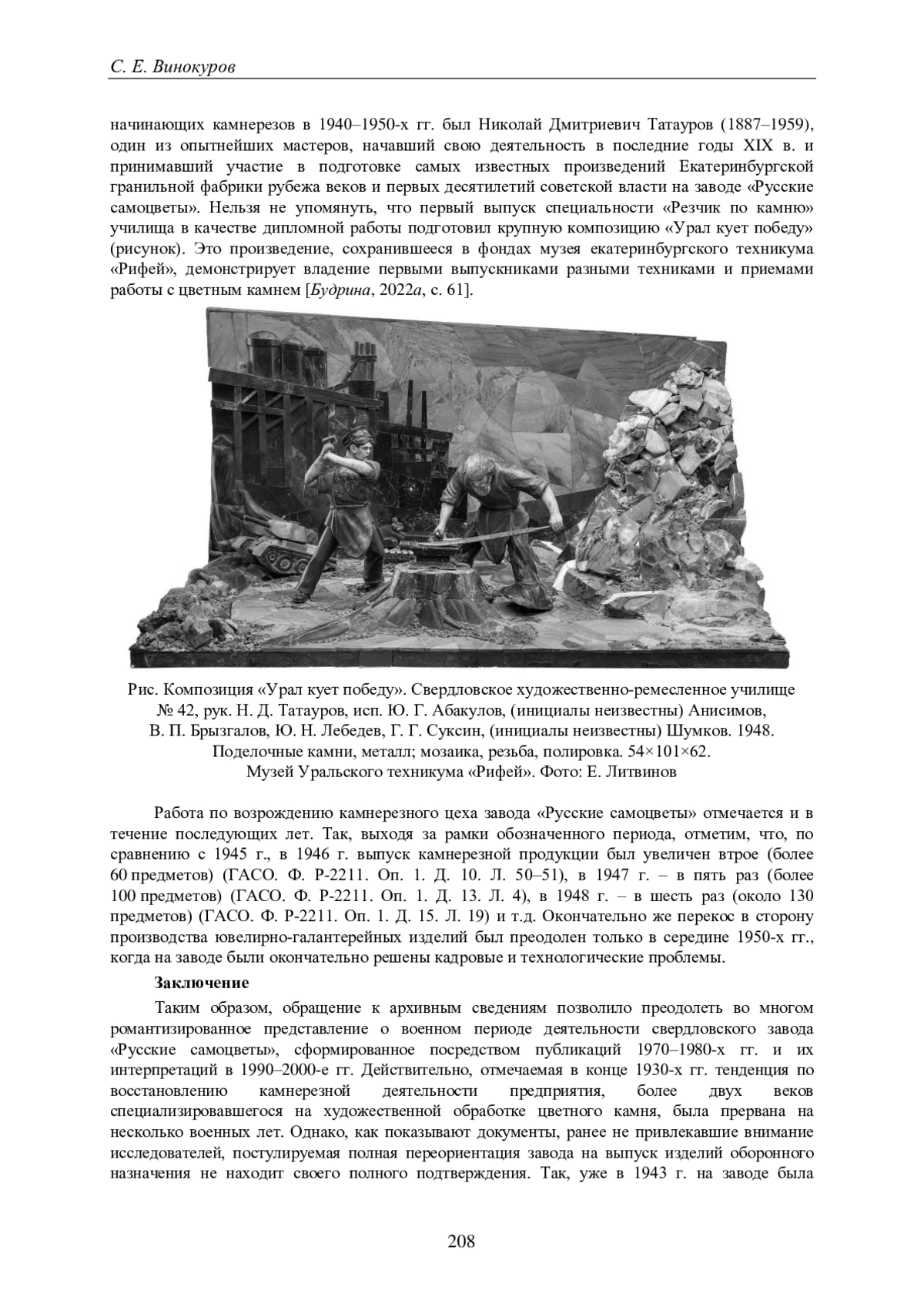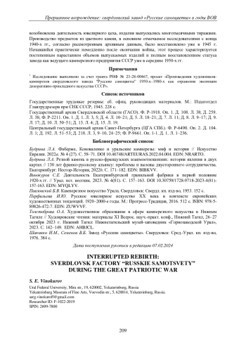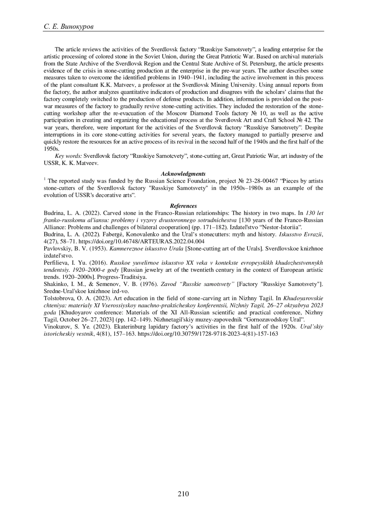 6. 	Винокуров С.Е. Деятельность Екатеринбургской гранильной фабрики в первой половине 1920-х гг. // Урал. ист. вестник. 2023. № 4(81). С. 157-163. DOI: 10.30759/1728-9718-2023-4(81)-157-163 EDN: MYQLYV