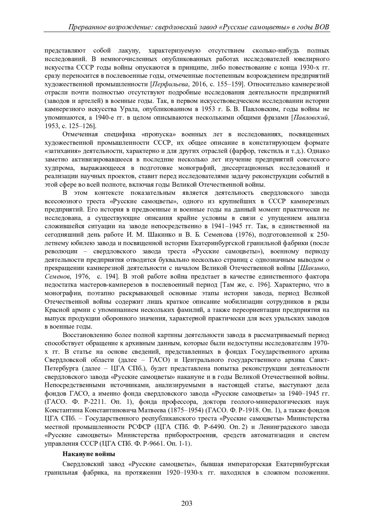 Одним из малоизученных периодов в истории отечественного камнерезного и ювелирного дела является советский период, до недавнего времени практически не привлекавший внимания специалистов. Годы Великой Отечественной войны в этом отношении представляют собой лакуну, характеризуемую отсутствием сколько-нибудь полных исследований. В немногочисленных опубликованных работах исследователей ювелирного искусства СССР годы войны опускаются в принципе, либо повествование с конца 1930-х гг. сразу переносится в послевоенные годы, отмеченные постепенным возрождением предприятий художественной промышленности [Перфильева, 2016, с. 155–159].