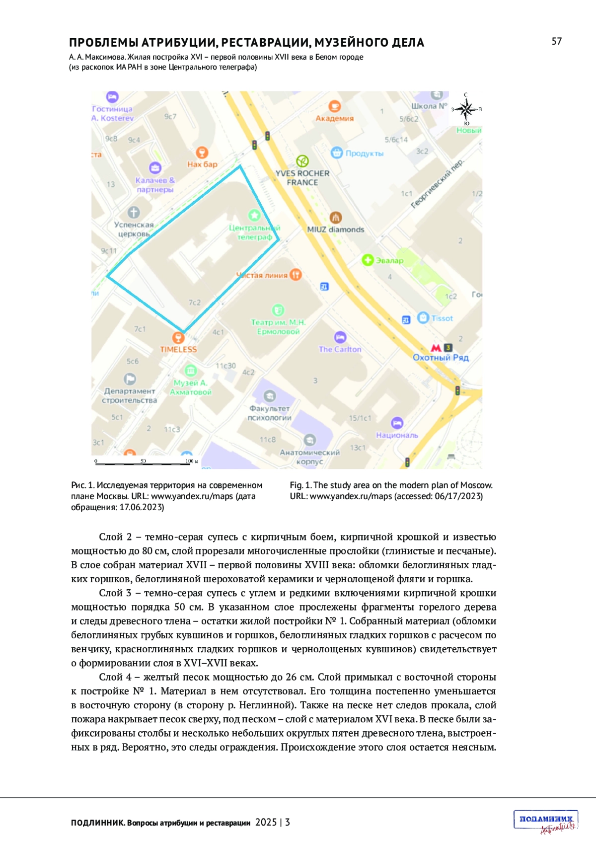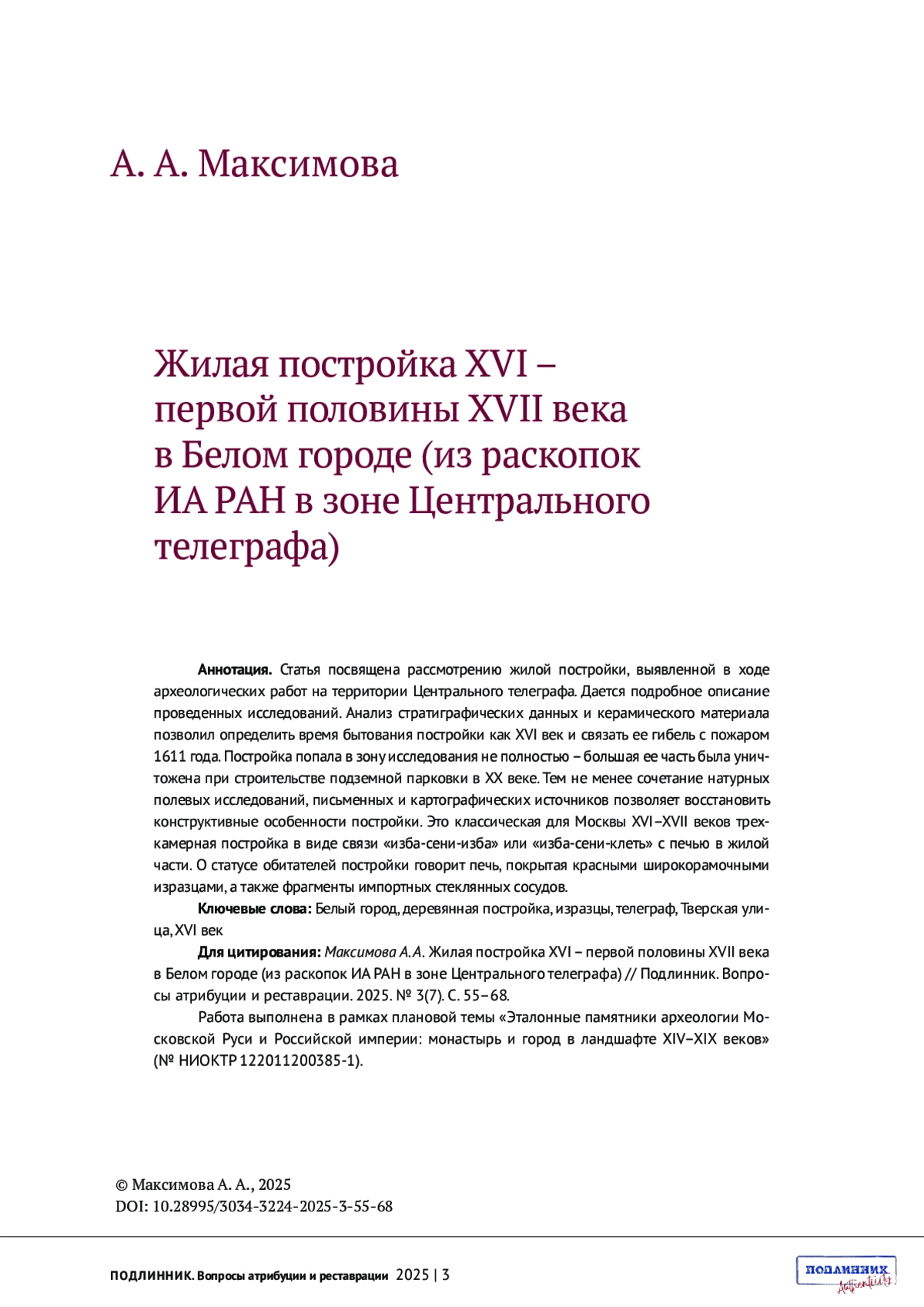 Цель этой статьи – ввести в оборот остатки еще одной детально изученной постройки средневековой Москвы. Дело в том, что до наших дней не сохранилось ни одного московского деревянного здания XVI–XVII веков; о том, как были устроены деревянные жилые сооружения той эпохи известно очень мало. Дискуссия о деревянной застройке русских городов того времени тянется, фактически, с эпохи самой застройки, но сведения письменных и изобразительных источников крайне ограничены и не особенно достоверны. Некоторую информацию о наземных и особенно, подземных частях сооружений получают в ходе археологических исследований. В силу этого, каждая вновь выявленная постройка является важным и ценным для науки подлинным свидетельством. Вводимая в оборот постройка обнаружена при исследованиях (раскопки и наблюдения) в зоне Центрального телеграфа с 2022 по 2024 год. Их проводил отдел археологии Московской Руси Института археологии РАН в связи с реставрацией и приспособлением для современного использования объекта культурного наследия «Здание Центрального телеграфа, 1927 год, архитектор И. И. Рерберг».