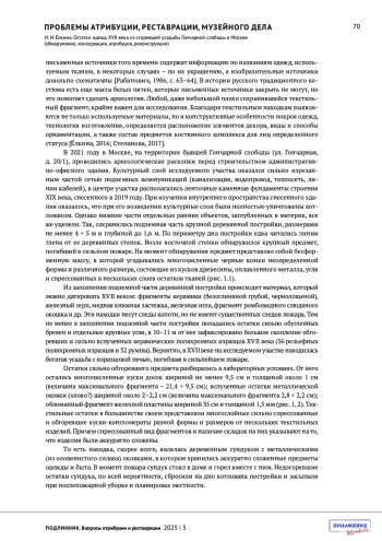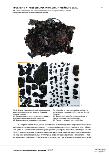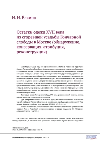 В 2021 году при археологических работах в Москве на территории бывшей Гончарной слободы были обнаружены остатки крупного предмета, побывавшего в сильнейшем пожаре. Остатки представляли собой обгоревшую бесформенную, разваливающуюся на отдельные части массу, состоящую из текстиля, фрагментов деревянных досок и металлических полос. Дальнейшее исследование дало возможность определить, что сгоревшим предметом являлся деревянный сундук с металлическими оковками, в котором хранились аккуратно сложенные предметы одежды допетровского времени. Комплексное изучение текстильных остатков, включающее материаловедческий, технологический, искусствоведческий анализ, дало возможность их атрибутировать, проанализировать крой и пошив, выявить индивидуальные особенности, а также на основе проведенных исследований выполнить полные или частичные графические реконструкции первоначального облика некоторых вещей.