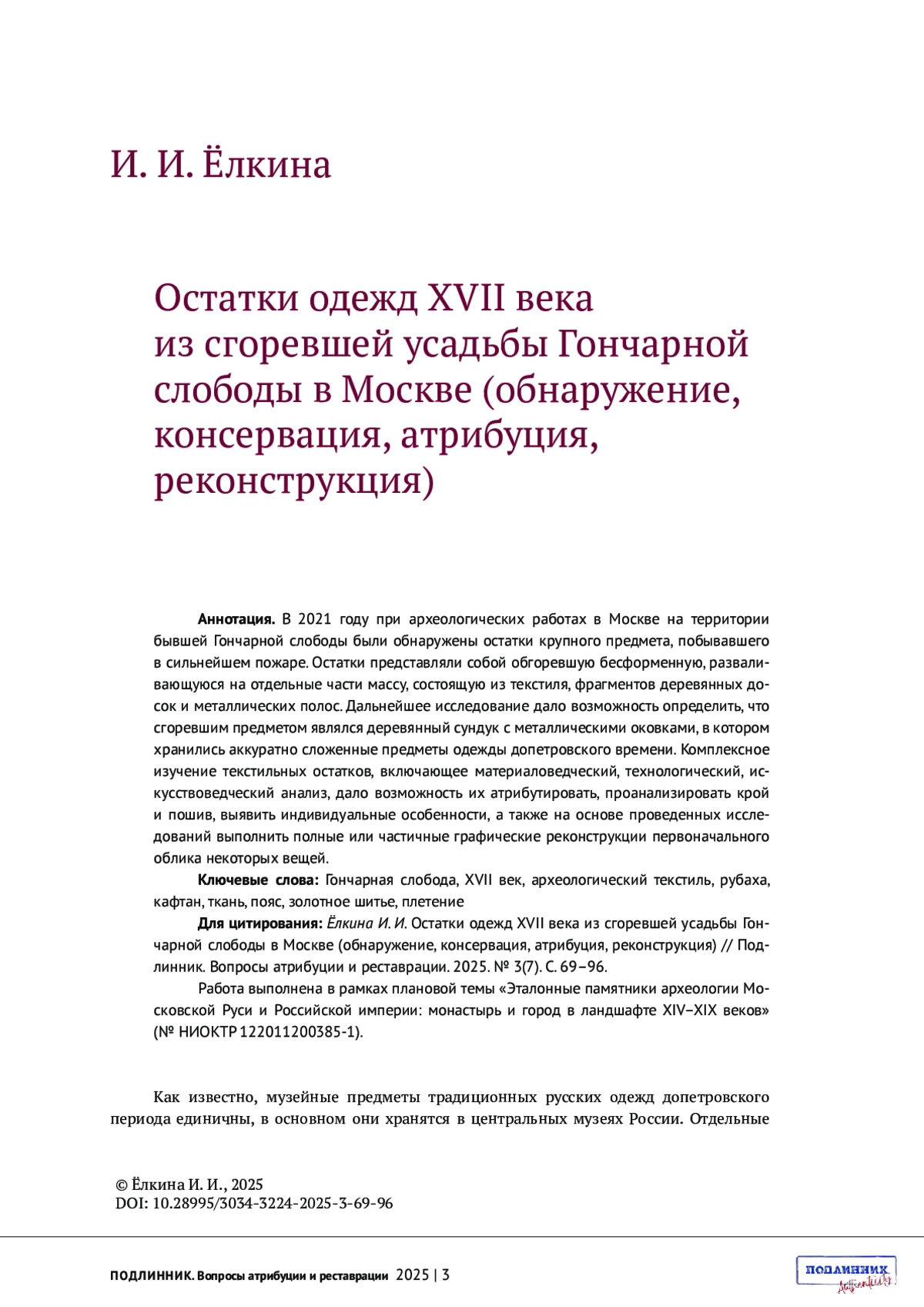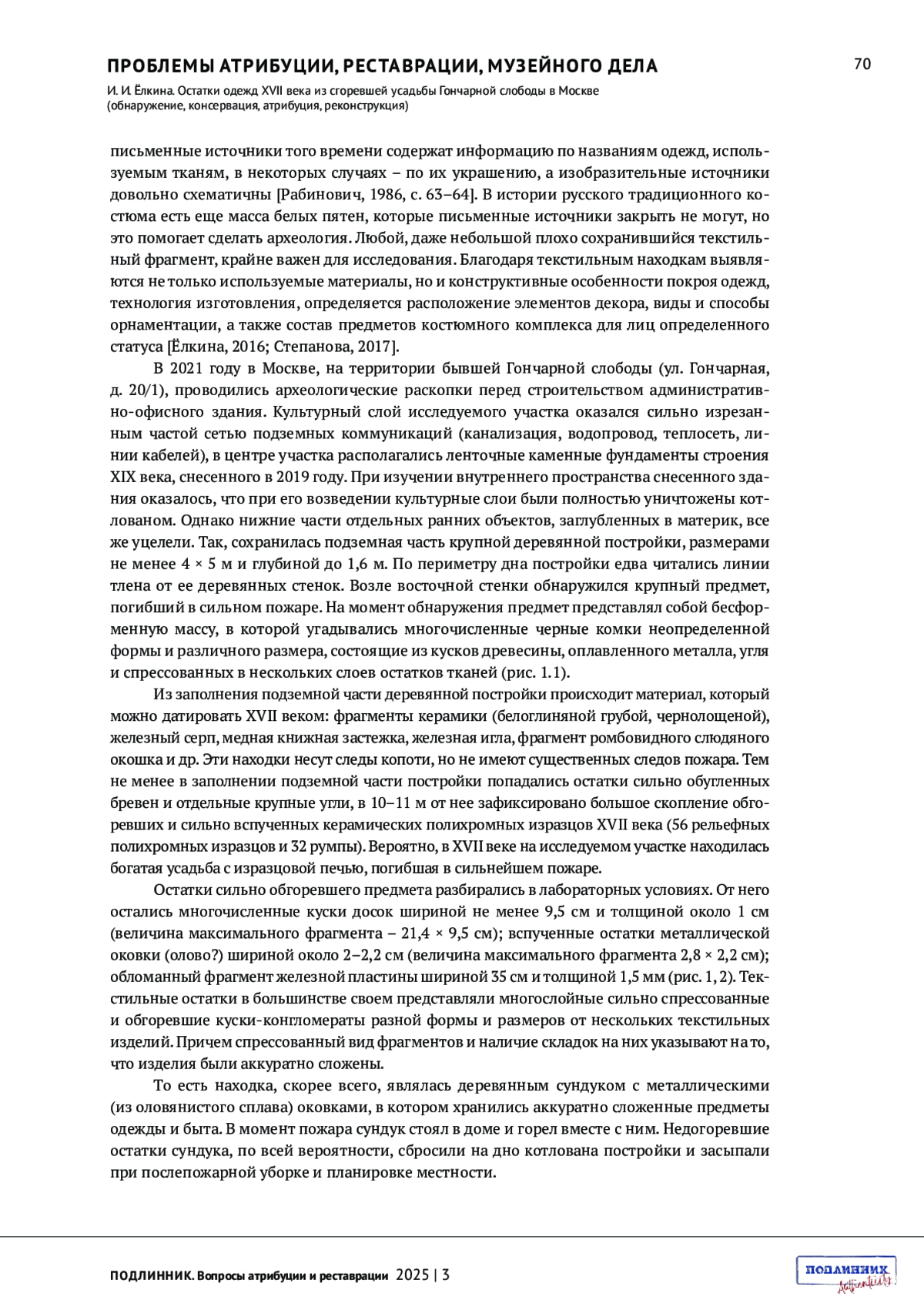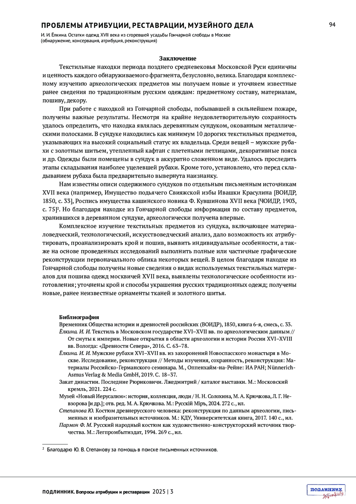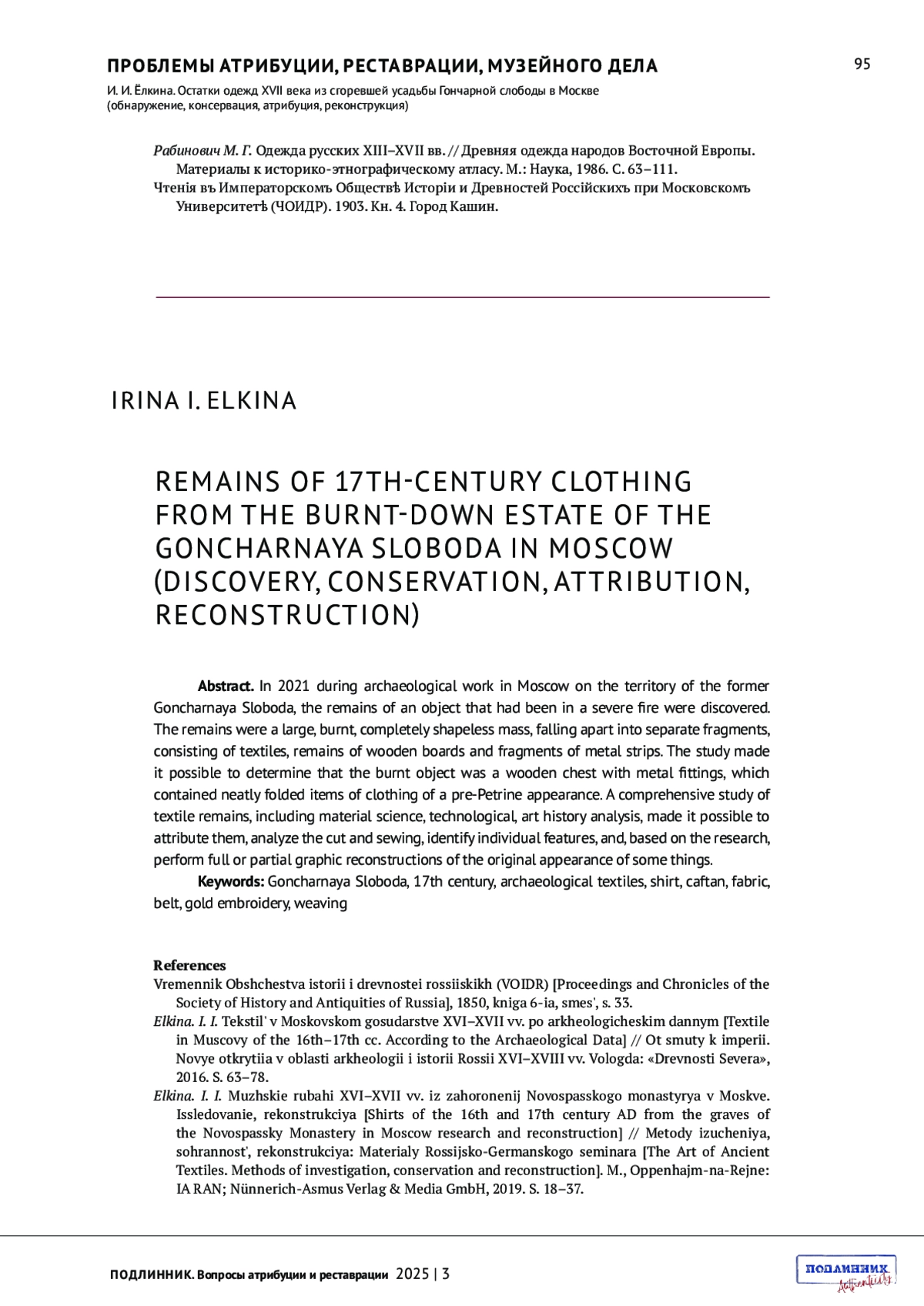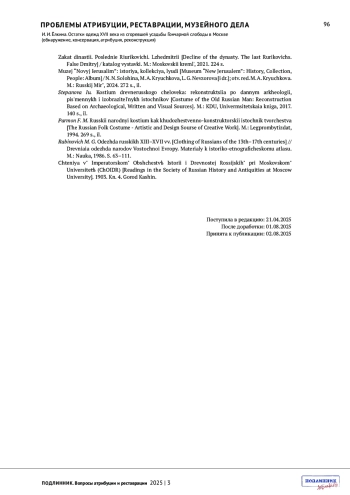 2. Ёлкина. И. И. Текстиль в Московском государстве XVI-XVII вв. по археологическим данным // От смуты к империи. Новые открытия в области археологии и истории России XVI-XVIII вв. Вологда: “Древности Севера”, 2016. С. 63-78.