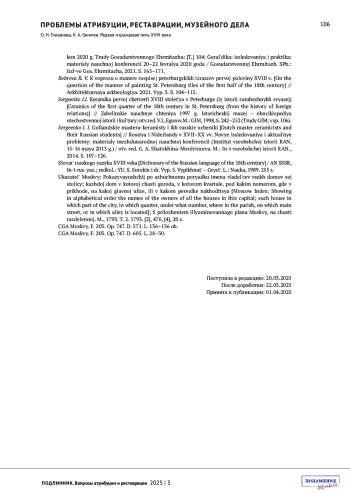 13. Сергеенко И. И. Керамика первой четверти XVIII столетья в Петербурге (из истории зарубежных связей) // Забелинские научные чтения 1997 г. Исторический музей - энциклопедия отечественной истории и культуры / отв. ред. В. Л. Егоров. М.: ГИМ, 1998, С. 242-252. (Труды ГИМ; вып. 106).