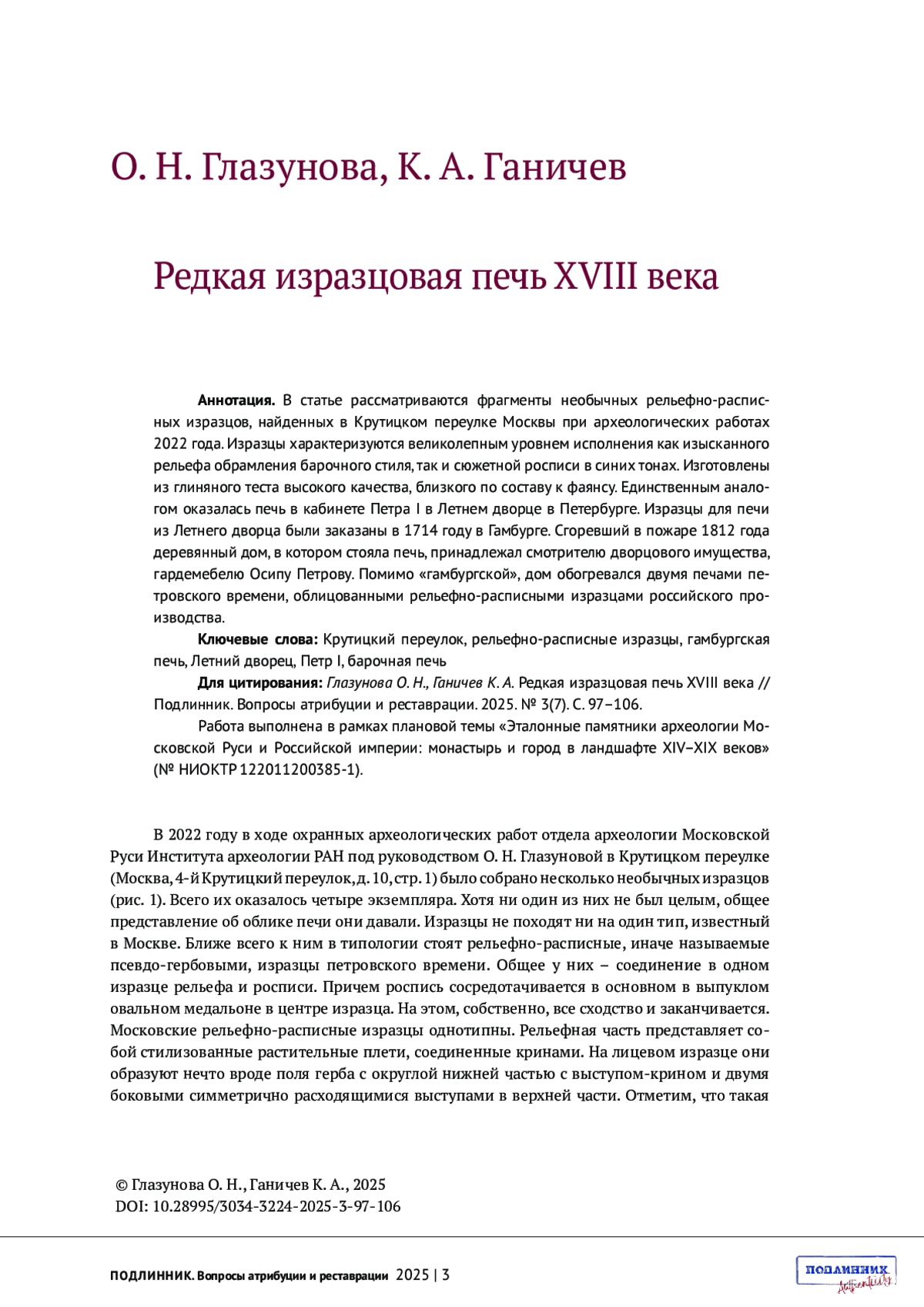 Материалы для выпускаемого номера целенаправленно собраны сотрудниками отдела археологии Московской Руси Института археологии РАН и основаны на источниках, которые изучает отдел. Такая строгая привязка к Москве и московскому периоду русской истории, да к археологическому материалу, может показаться неожиданной в журнале «Подлинник». На самом деле, этот подход глубоко логичен. Во-первых, Отдел входит в состав организаторов журнала, а также принимает живое участие в формировании всех ступеней развития семинара «Вещь: время и место». В то же время Отдел – неотъемлемая часть археологического сообщества, которое глубоко заинтересовано в развитии приемов источниковедческого анализа, в утверждении и совершенствовании всего направления экспертной деятельности. Археолог по всему роду своей научной деятельности постоянно выступает как эксперт, идет ли речь о предметном мире, об экофактах, которые образуют все более мощную прослойку в массиве материалов, хранящих сведения о прошлом, или об архивных документах, в которые, кстати, постоянно преобразуются изученные слои, погребальные памятники и строительные объекты.