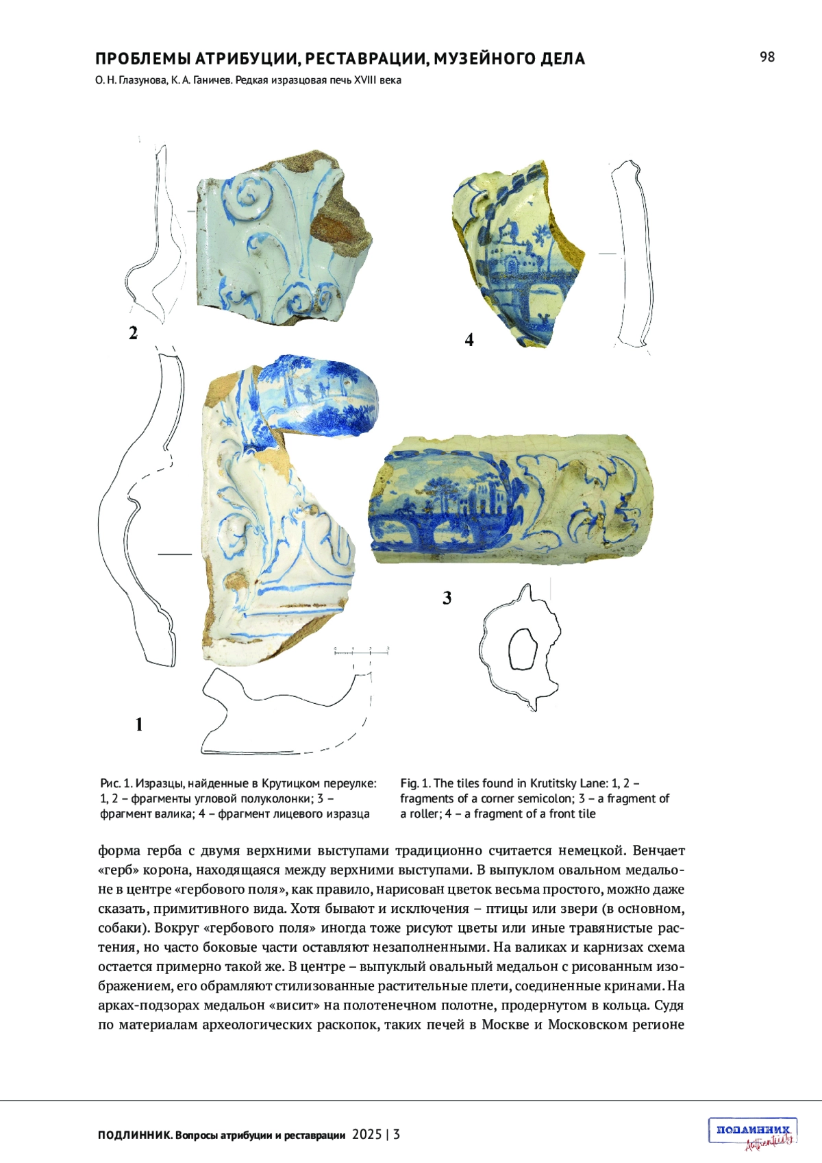 В 2022 году в ходе охранных археологических работ отдела археологии Московской Руси Института археологии РАН под руководством О. Н. Глазуновой в Крутицком переулке (Москва, 4-й Крутицкий переулок, д. 10, стр. 1) было собрано несколько необычных изразцов (рис. 1). Всего их оказалось четыре экземпляра.