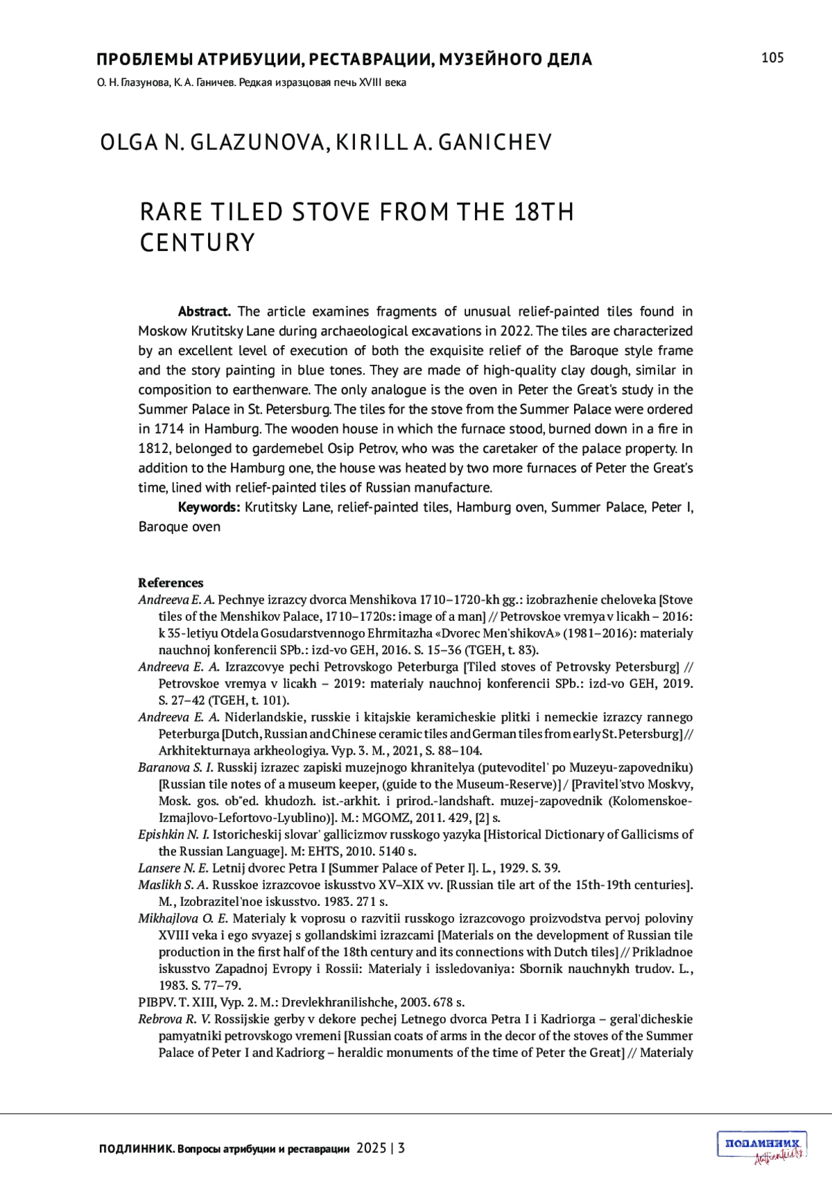 2. Андреева Е. А. Изразцовые печи Петровского Петербурга // Петровское время в лицах - 2019: материалы научной конференции СПб.: изд-во ГЭ, 2019. С. 27-42 (ТГЭ, т. 101).