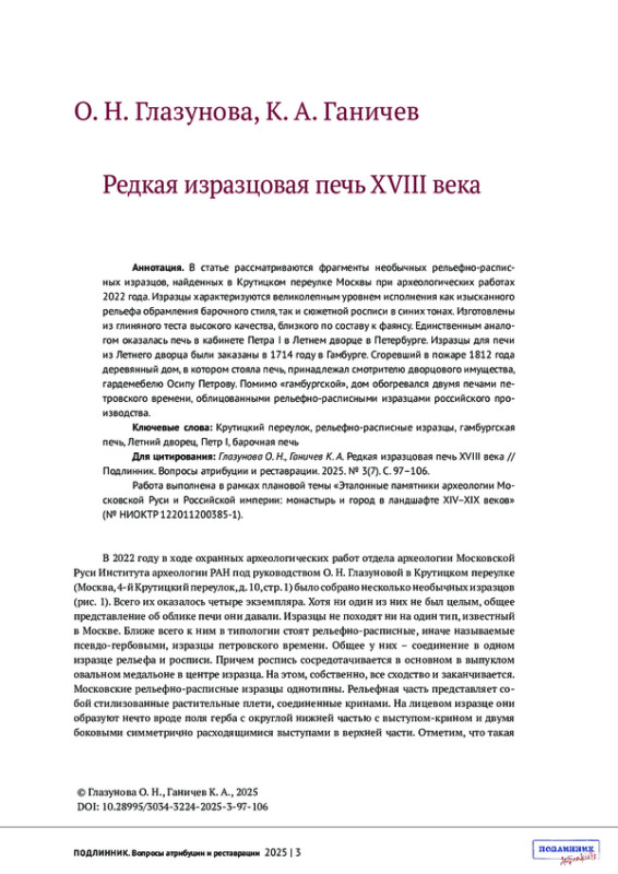 В статье рассматриваются фрагменты необычных рельефно-расписных изразцов, найденных в Крутицком переулке Москвы при археологических работах 2022 года. Изразцы характеризуются великолепным уровнем исполнения как изысканного рельефа обрамления барочного стиля, так и сюжетной росписи в синих тонах. Изготовлены из глиняного теста высокого качества, близкого по составу к фаянсу. Единственным аналогом оказалась печь в кабинете Петра I в Летнем дворце в Петербурге. Изразцы для печи из Летнего дворца были заказаны в 1714 году в Гамбурге. Сгоревший в пожаре 1812 года деревянный дом, в котором стояла печь, принадлежал смотрителю дворцового имущества, гардемебелю Осипу Петрову. Помимо «гамбургской», дом обогревался двумя печами петровского времени, облицованными рельефно-расписными изразцами российского производства.