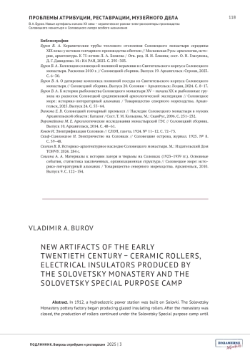 2. Буров В. А. Коллекция соловецкой поливной керамики из Святительского корпуса Соловецкого монастыря. Раскопки 2010 г. // Соловецкий сборник. Выпуск 19. Архангельск: Строки, 2023. С. 6-30.