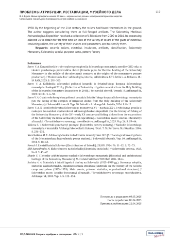 3. Буров В. А. О датировке комплекса поливной посуды из Святительского корпуса Соловецкого монастыря // Соловецкий сборник. Выпуск 20. Соловки - Архангельск: Лоция, 2024. С. 8-17. EDN: VFDLDG