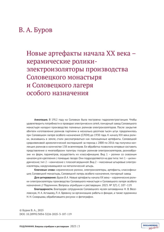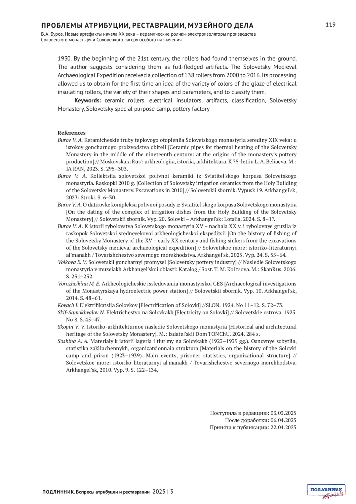 1. Буров В. А. Керамические трубы теплового отопления Соловецкого монастыря середины XIX века: у истоков гончарного производства обители // Московская Русь: археология, история, архитектура. К 75-летию Л. А. Беляева / Отв. ред. И. И. Ёлкина; сост. О. Н. Глазунова, Д. Г. Давиденко. М.: ИА РАН, 2023. С. 295-303.