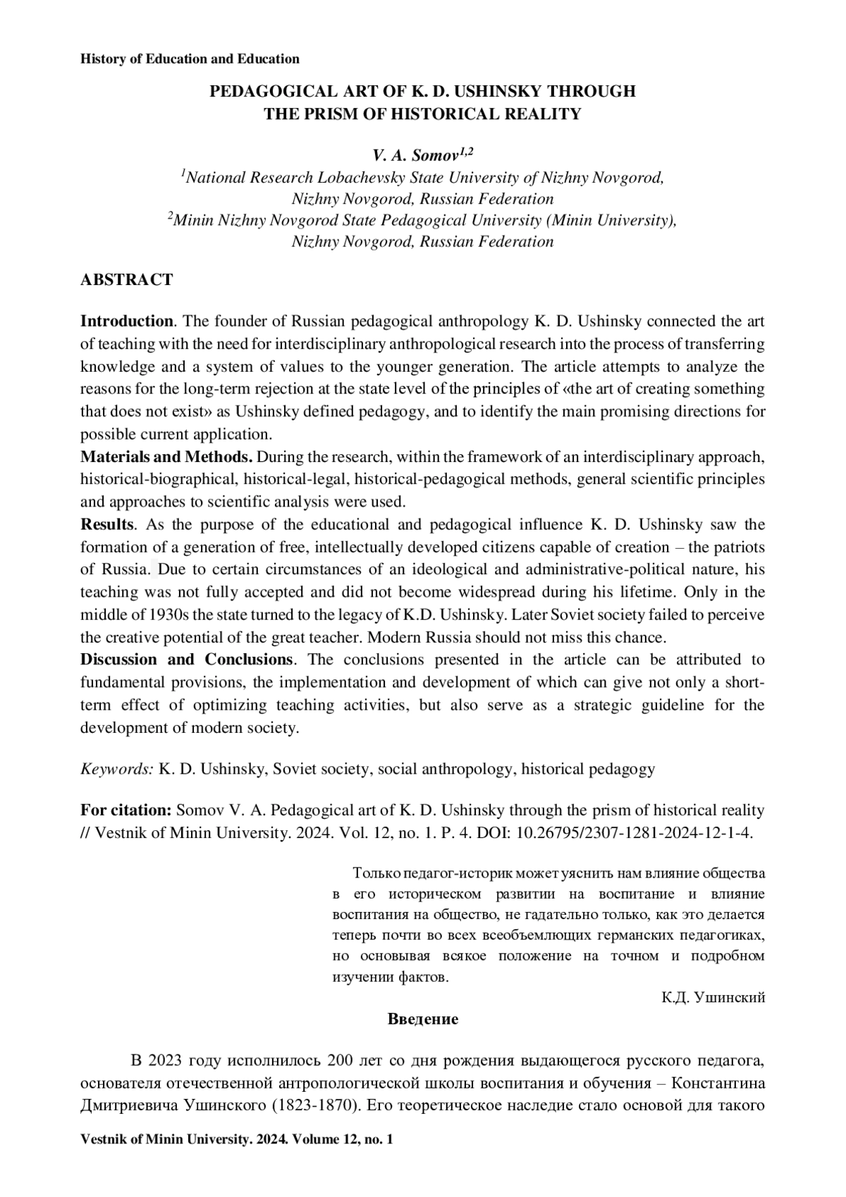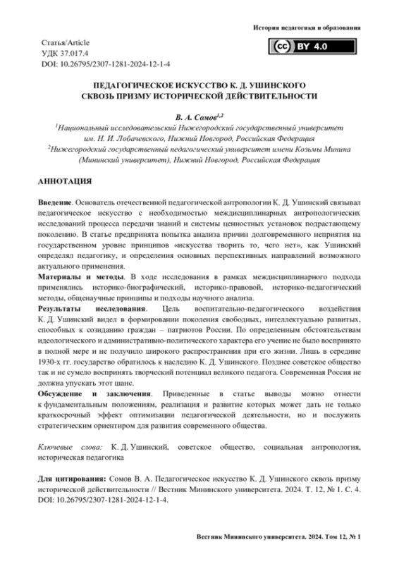Введение. Основатель отечественной педагогической антропологии К. Д. Ушинский связывал педагогическое искусство с необходимостью междисциплинарных антропологических исследований процесса передачи знаний и системы ценностных установок подрастающему поколению. В статье предпринята попытка анализа причин долговременного неприятия на государственном уровне принципов «искусства творить то, чего нет», как Ушинский определял педагогику, и определения основных перспективных направлений возможного актуального применения.