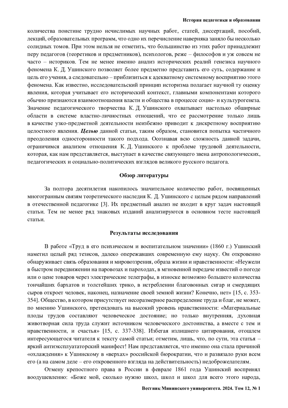Результаты исследования. Цель воспитательно-педагогического воздействия К. Д. Ушинский видел в формировании поколения свободных, интеллектуально развитых, способных к созиданию граждан – патриотов России. По определенным обстоятельствам идеологического и административно-политического характера его учение не было воспринято в полной мере и не получило широкого распространения при его жизни. Лишь в середине 1930-х гг. государство обратилось к наследию К. Д. Ушинского. Позднее советское общество так и не сумело воспринять творческий потенциал великого педагога. Современная Россия не должна упускать этот шанс.