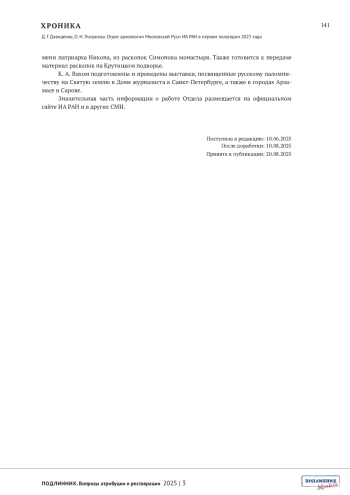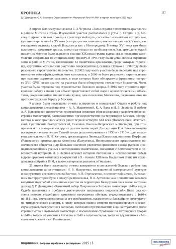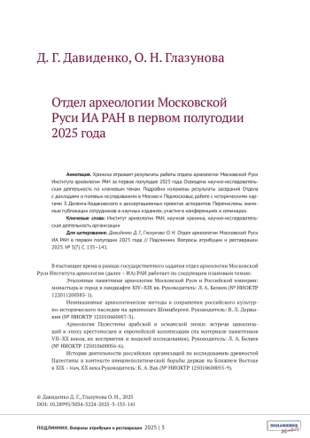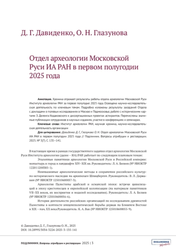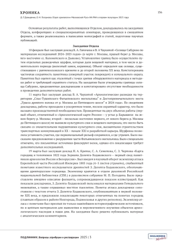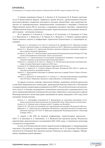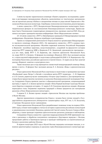 Хроника отражает результаты работы отдела археологии Московской Руси Института археологии РАН за первое полугодие 2025 года. Освещена научно-исследовательская деятельность по ключевым темам. Подробно изложены результаты заседаний Отдела с докладами о полевых исследованиях в Москве и Подмосковье, работе с историческими картами З. Доленга-Ходаковского и диссертационных проектах аспирантов. Перечислены значимые публикации сотрудников в научных изданиях, участие в конференциях и семинарах.