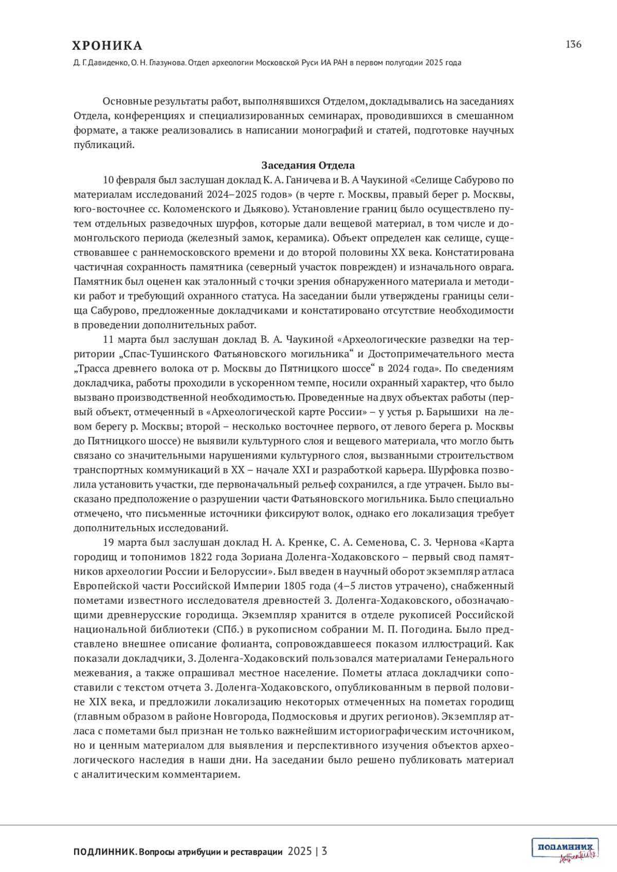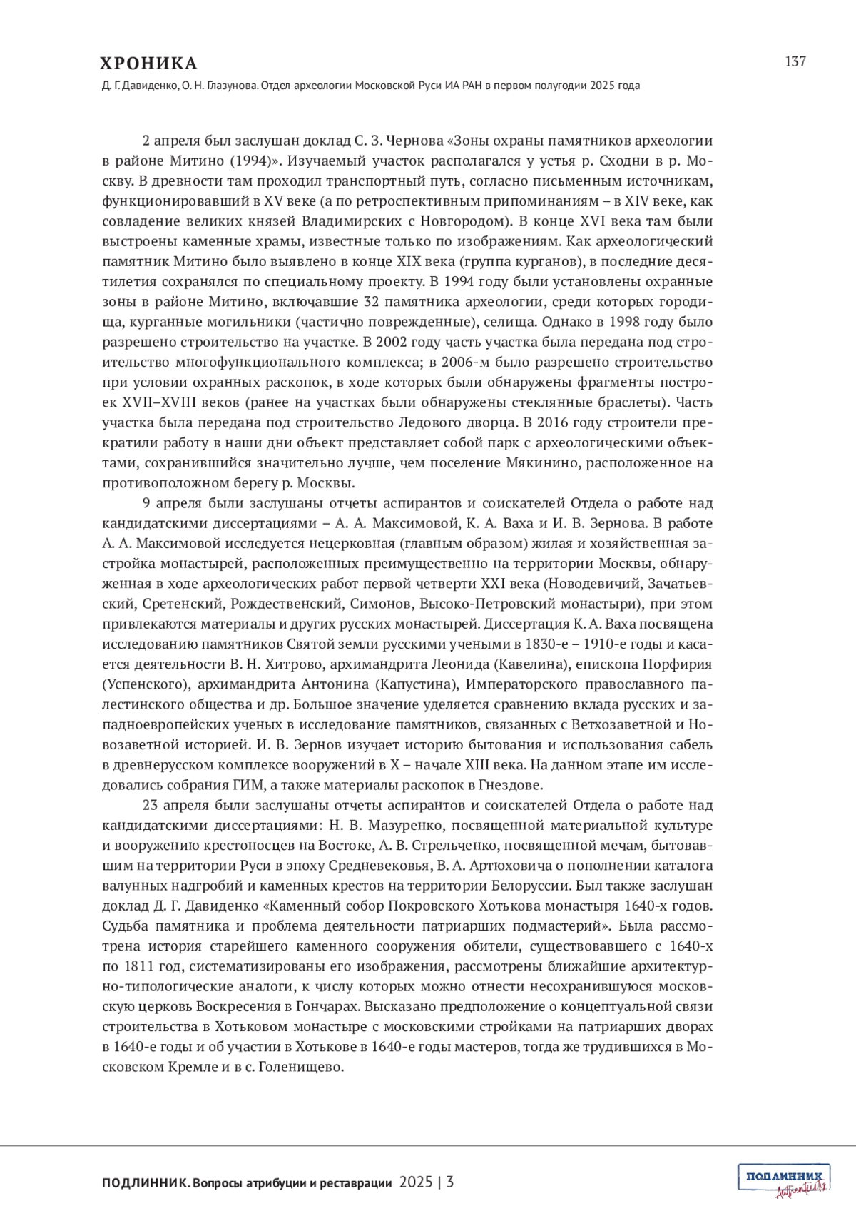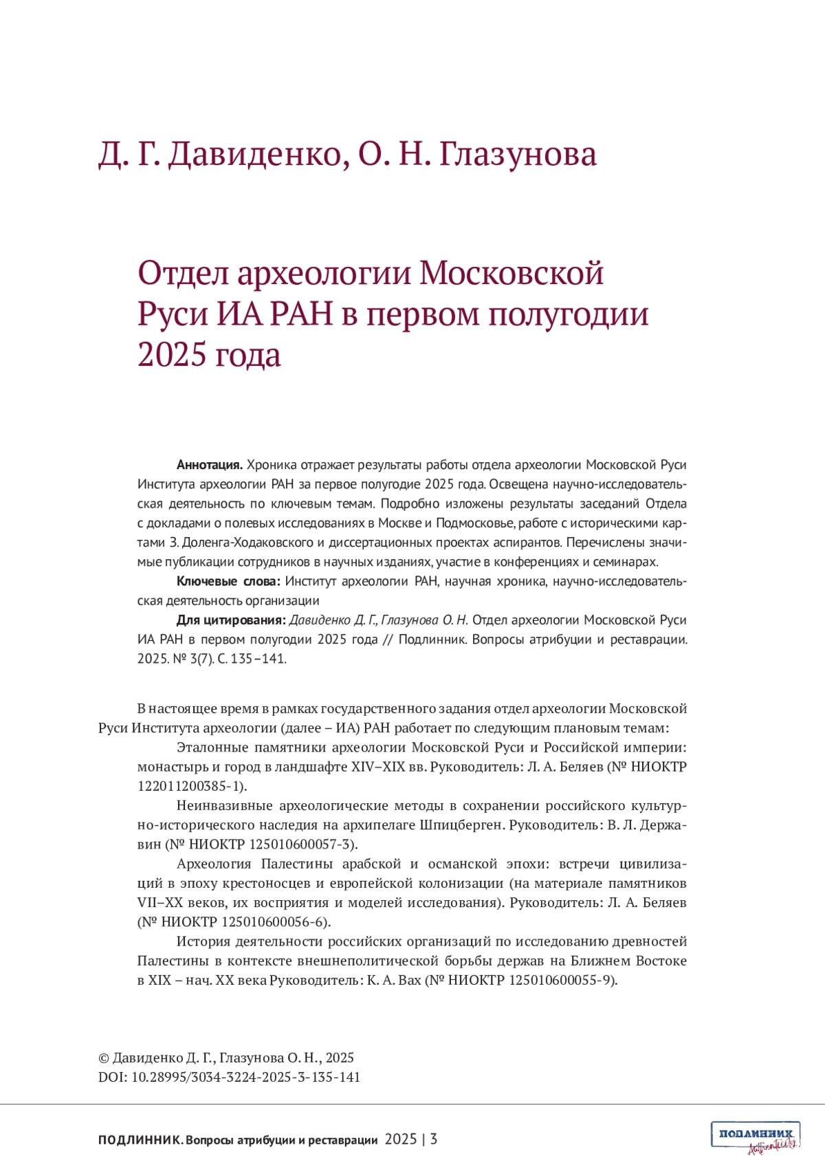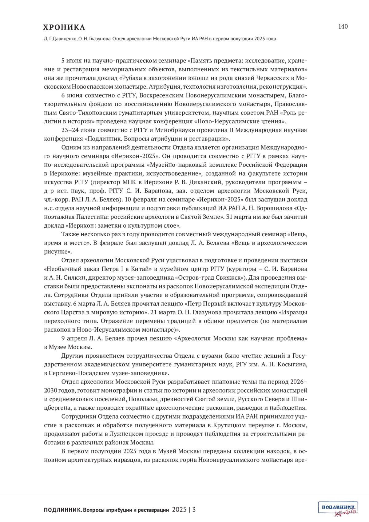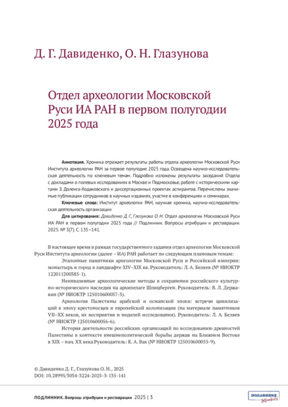 Материалы для выпускаемого номера целенаправленно собраны сотрудниками отдела археологии Московской Руси Института археологии РАН и основаны на источниках, которые изучает отдел. Такая строгая привязка к Москве и московскому периоду русской истории, да к археологическому материалу, может показаться неожиданной в журнале «Подлинник». На самом деле, этот подход глубоко логичен. Во-первых, Отдел входит в состав организаторов журнала, а также принимает живое участие в формировании всех ступеней развития семинара «Вещь: время и место». В то же время Отдел – неотъемлемая часть археологического сообщества, которое глубоко заинтересовано в развитии приемов источниковедческого анализа, в утверждении и совершенствовании всего направления экспертной деятельности. Археолог по всему роду своей научной деятельности постоянно выступает как эксперт, идет ли речь о предметном мире, об экофактах, которые образуют все более мощную прослойку в массиве материалов, хранящих сведения о прошлом, или об архивных документах, в которые, кстати, постоянно преобразуются изученные слои, погребальные памятники и строительные объекты.