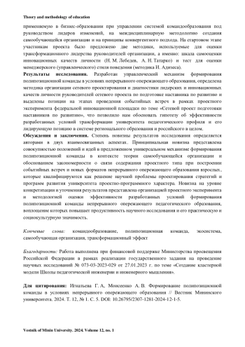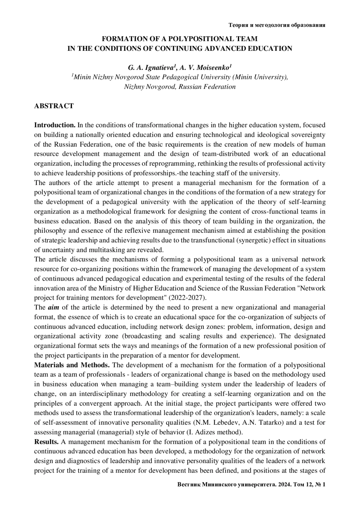 Введение. В условиях трансформационных изменений системы высшего образования, ориентированной на построение национально ориентированного образования и обеспечение технологического и мировоззренческого суверенитета Российской Федерации, одним из базовых требований является создание новых моделей управления развитием человеческих ресурсов и проектирование командно-распределенной работы образовательной организации, включая процессы перепрограммирования, переосмысления результатов профессиональной деятельности для достижения лидерских позиций профессорско-преподавательского состава университета. Авторы статьи осуществляют попытку представить управленческий механизм формирования полипозиционной команды организационных изменений в условиях построения новой стратегии развития педагогического университета с выходом на применение теории самообучающейся организации в качестве методологической рамки проектирования содержания деятельности кросс-функциональных команд в бизнес-образовании. На основе анализа данной теории командообразования в организации раскрывается философия и суть рефлексивного механизма управления, направленного на становление позиции стратегического лидерства и достижения результата за счет трансфункционального (синергетического) эффекта в ситуациях неопределенности и многозадачности. В статье рассматриваются механизмы формирования полипозиционной команды в качестве универсального сетевого ресурса соорганизации позиций в рамках управления развитием системы непрерывного опережающего педагогического образования и экспериментальной апробации полученных результатов в рамках деятельности ФИП университета по построению наставнической практики с 2022 г. по 2027 г.