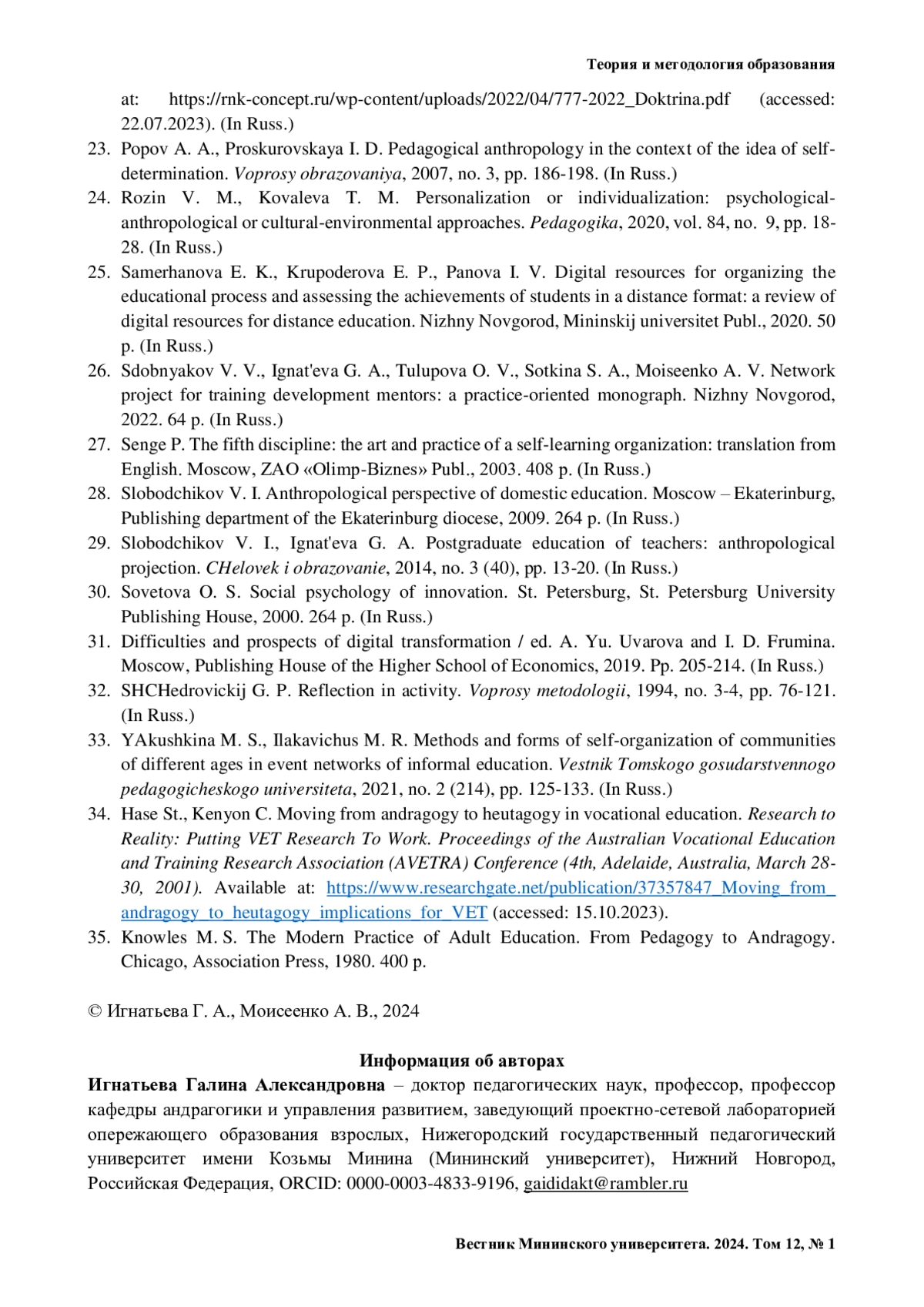 34. Hase St., Kenyon C. Moving from andragogy to heutagogy in vocational education // Research to Reality: Putting VET Research To Work. Proceedings of the Australian Vocational Education and Training Research Association (AVETRA) Conference (4th, Adelaide, Australia, March 28-30, 2001). Available at: https://www.researchgate.net/publication/37357847_Moving_from_ andragogy_to_heutagogy_implications_for_VET (accessed: 15.10.2023).