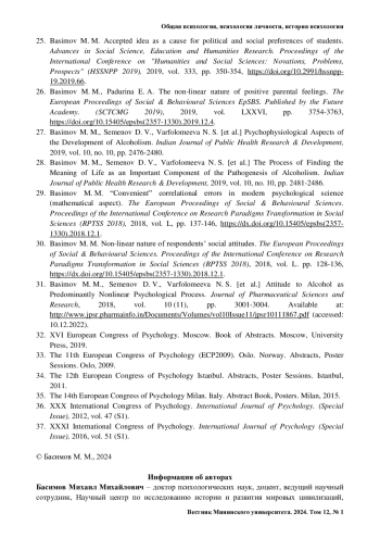 31. Basimov M. M., Semenov D. V., Varfolomeeva N. S. [et al.] Attitude to Alcohol as Predominantly Nonlinear Psychological Process. Journal of Pharmaceutical Sciences and Research, 2018, vol. 10 (11), pp. 3001-3004. Available at: http://www.jpsr.pharmainfo.in/Documents/Volumes/vol10Issue11/jpsr10111867.pdf (accessed: 10.12.2022).