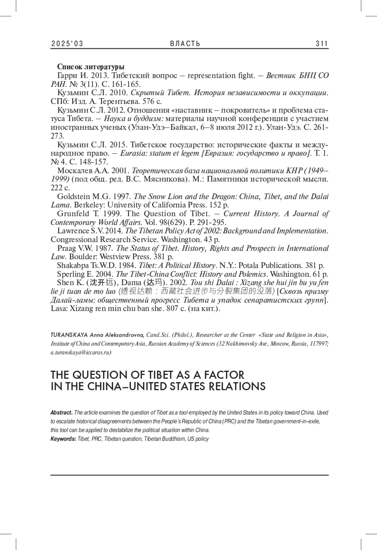 1. Гарри И. 2013. Тибетский вопрос - representation fight. - Вестник БНЦ СО РАН. № 3(11). С. 161-165.