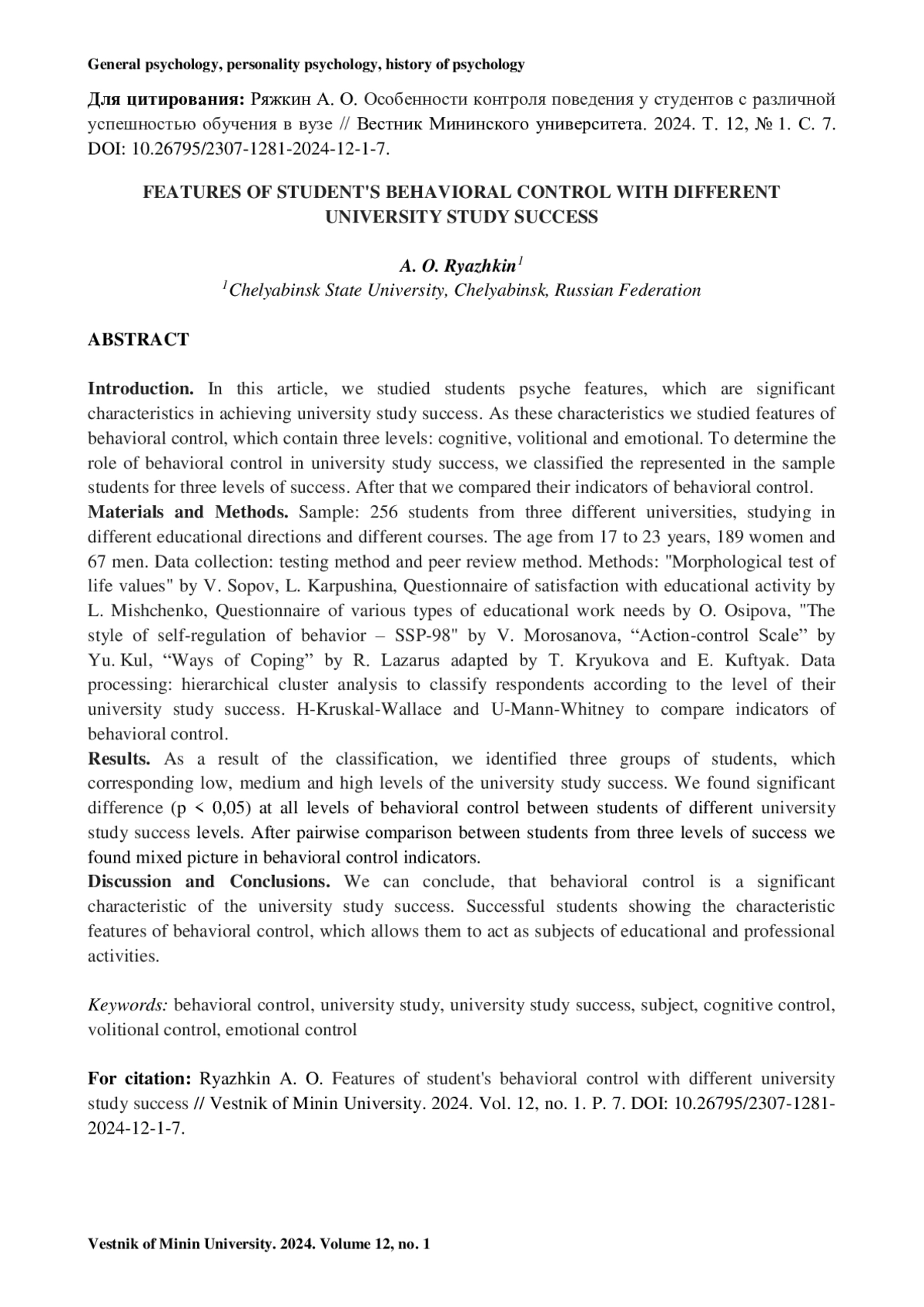 Введение. Исследуются особенности психики студентов, выступающие значимыми характеристиками при достижении успешности обучения в вузе. В качестве данных характеристик изучены особенности контроля поведения, состоящего из трех уровней: когнитивного, волевого и эмоционального. Для определения роли контроля поведения в успешности обучения в вузе студенты, представленные в выборке, были классифицированы по трем уровням успешности, после чего было проведено сравнение показателей контроля их поведения.