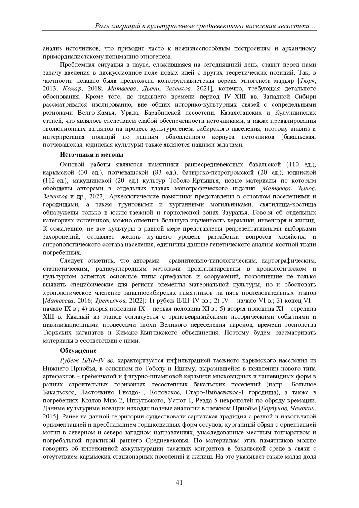 40. Матвеева Н. П., Третьяков Е.А., Зеленков А.С. Свидетельства миграции группы южно-таежного населения Западной Сибири на Урал в раннем Средневековье (могильник Воденниково-1) // Археология, этнография и антропология Евразии. 2021. Т. 49, № 4. С. 91-99. DOI: 10.17746/1563-0102.2021.49.4.091-099 EDN: TFOESG