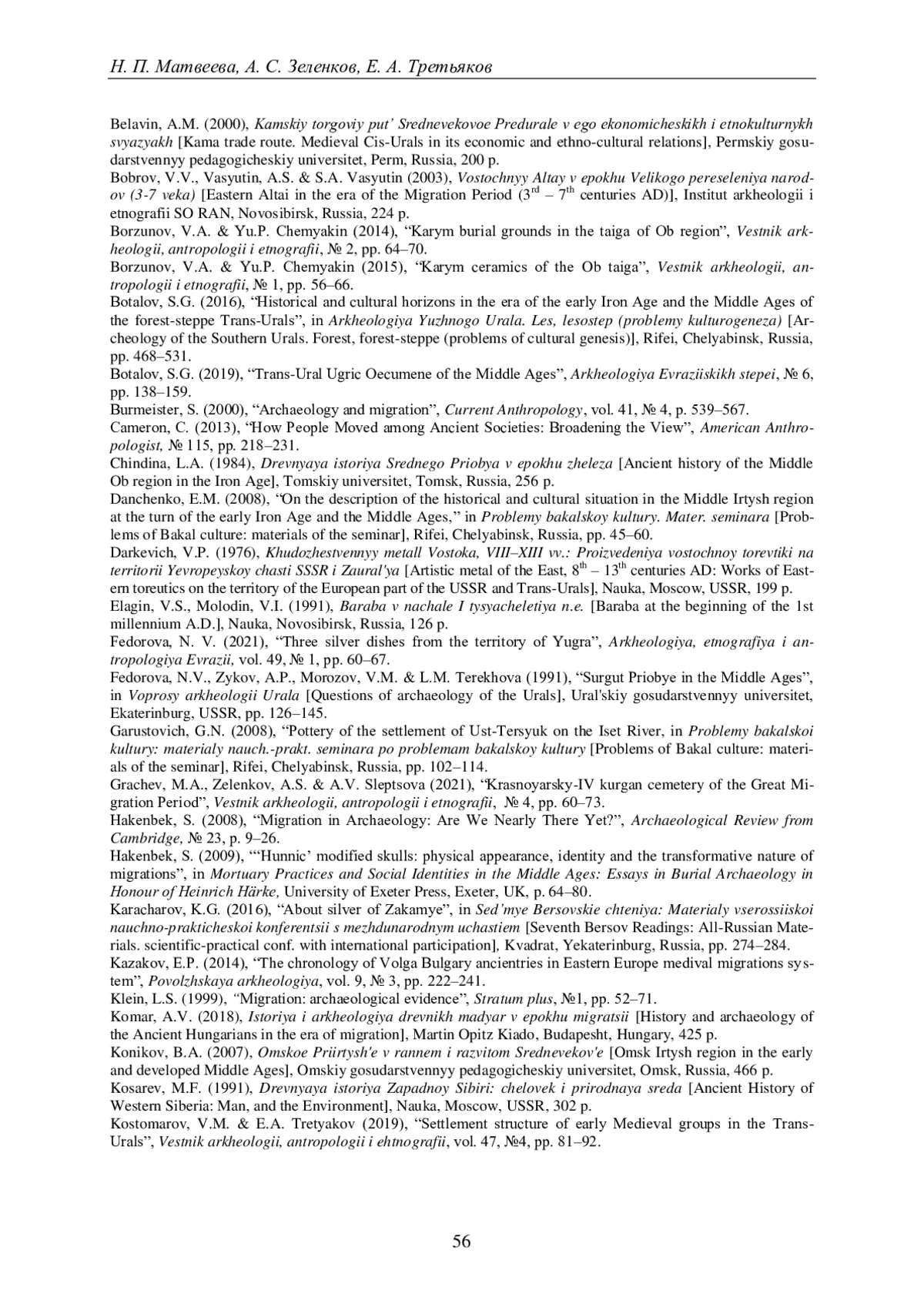 55. Третьяков Е.А. Хронологические комплексы средневековых памятников Западной Сибири // Вестник археологии, антропологии и этнографии. 2022. № 1(56). С. 134-147. EDN: WNAKGW