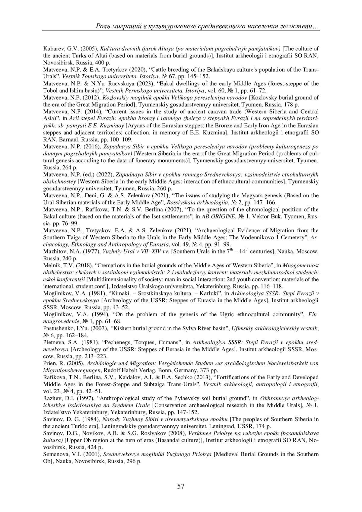 35. Матвеева Н.П., Зыков А.П., Зеленков А.С. [и др.]. Западная Сибирь в эпоху раннего Средневековья: взаимодействие этнокультурных общностей. Тюмень: Изд-во Тюмен. гос. ун-та, 2022. 260 с. EDN: GOYKBP