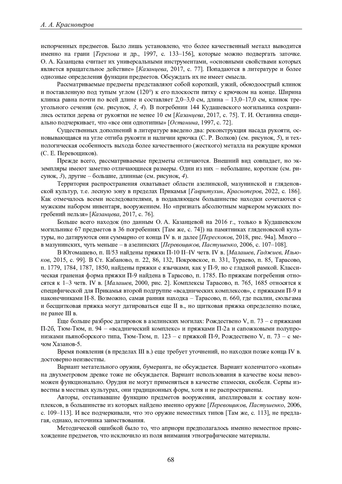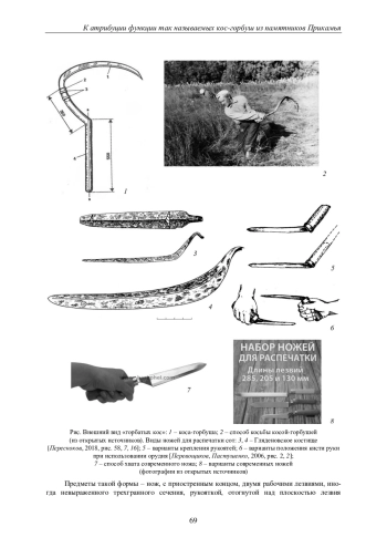 В погребениях и, единично, на поселениях ряда средневековых культур Прикамья встречается специфическая категория находок, известных в литературе как «косы-горбуши». Массовые находки известны не позднее, чем с раскопок В. Ф. Генинга на Тураевском курганном могильнике. Он же и ввел это название [Генинг, 1976, с. 87‒88], оперируя довольно случайным и весьма далеким сходством с этнографическими типами хозяйственного инвентаря (рисунок, 1, 2).