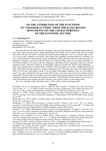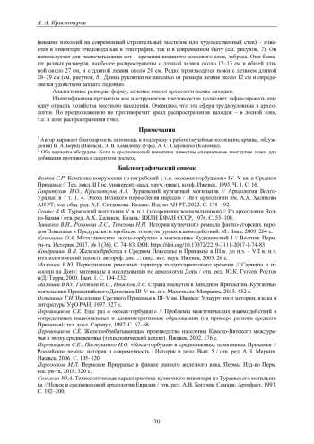 1. Волков С.Р. Комплекс вооружения из погребений с т.н. “косами-горбушами” IV-V вв. в Среднем Прикамье // Тез. докл. II Рос. университ.-акад. науч.-практ. конф. Ижевск, 1995. Ч. 1. С. 16.