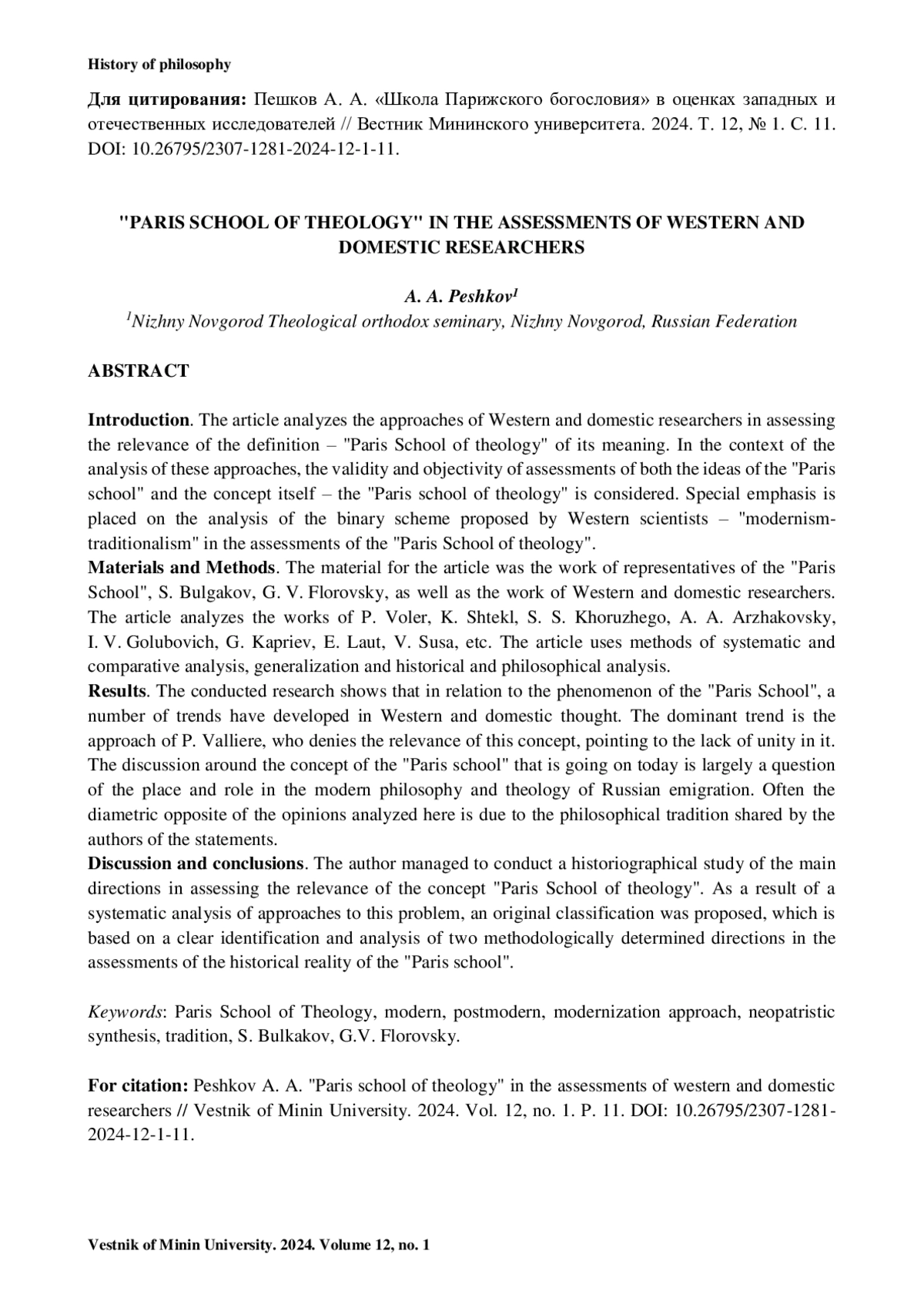 23. Пешков А. А. Современная оценка концепции неопатрического синтеза Г. В. Флоровского в контексте модернизационного подхода // Вестник Мининского университета. 2022. Т. 10, № 1. С. 10.