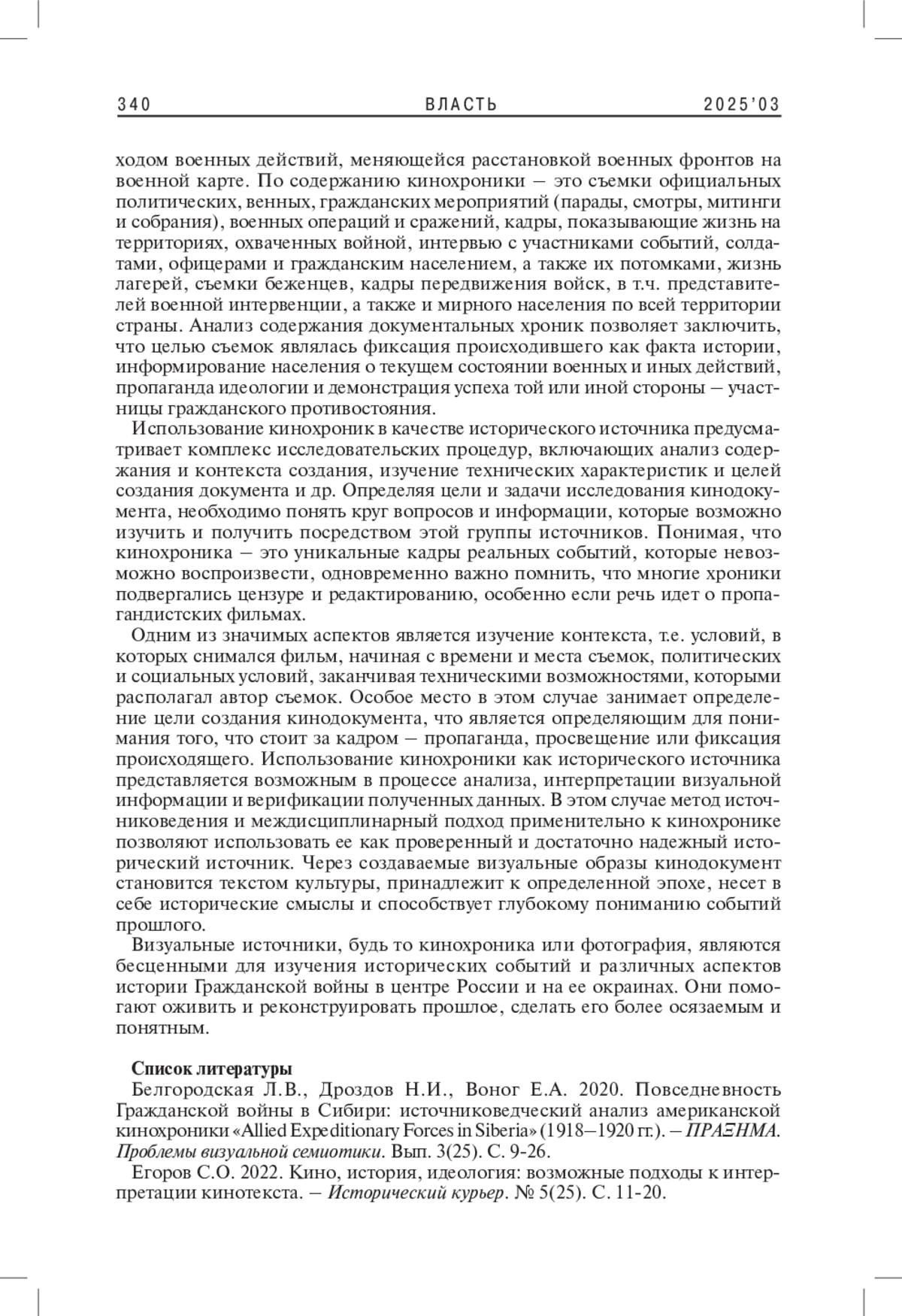 1. 	Белгородская Л.В., Дроздов Н.И., Воног Е.А. 2020. Повседневность Гражданской войны в Сибири: источниковедческий анализ американской кинохроники “Allied Expeditionary Forces in Siberia” (1918-1920 гг.). - ΠΡΑΞΗMΑ. Проблемы визуальной семиотики. Вып. 3(25). С. 9-26.