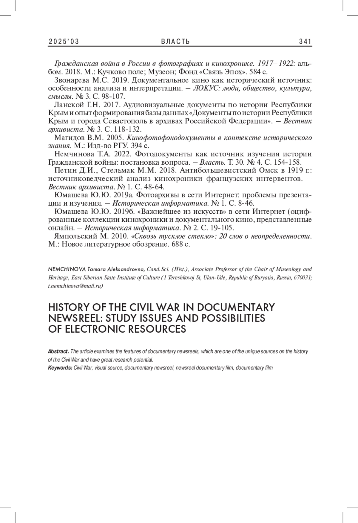7. 	Немчинова Т.А. 2022. Фотодокументы как источник изучения истории Гражданской войны: постановка вопроса. - Власть. Т. 30. № 4. С. 154-158. EDN: XMUFRK