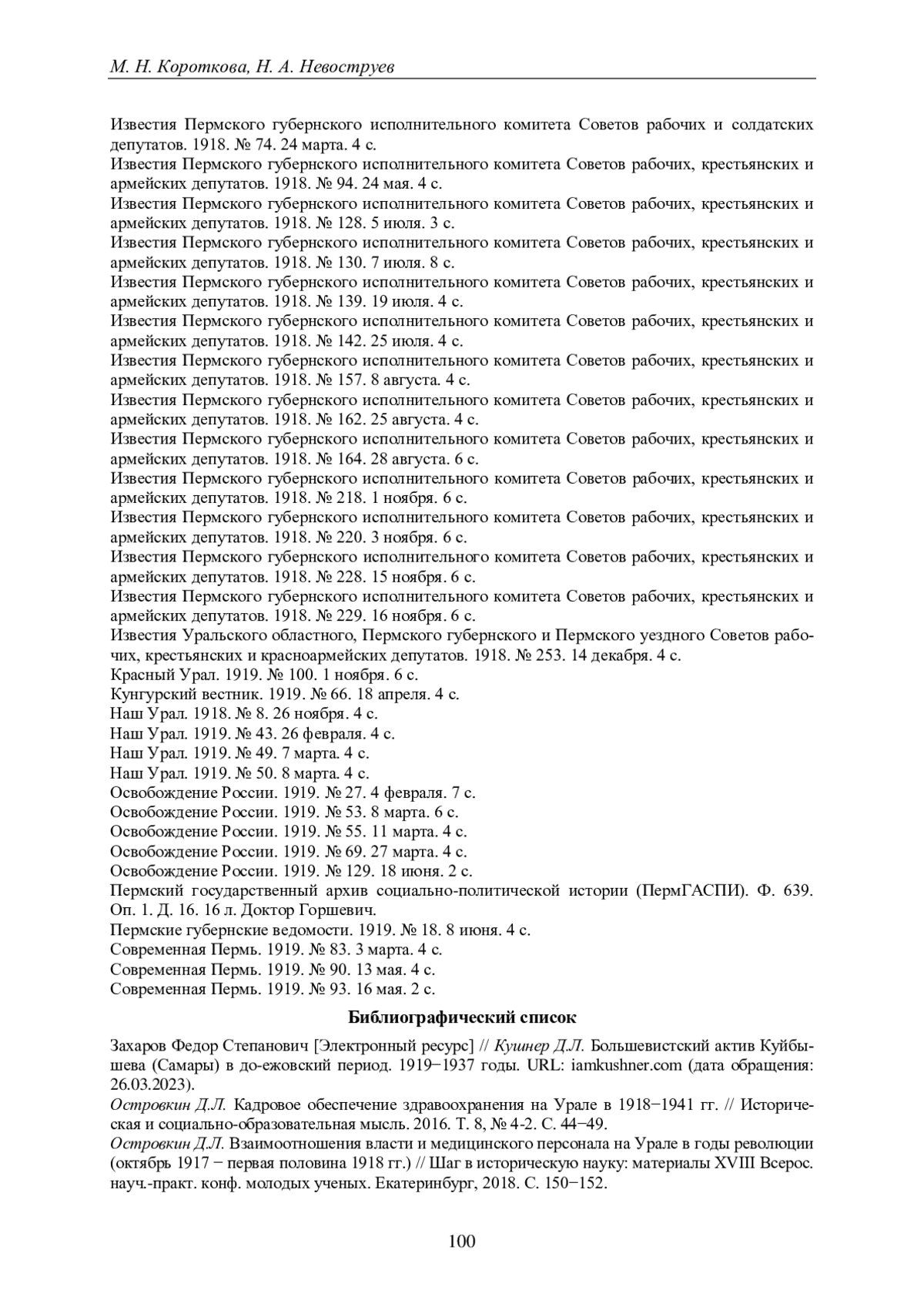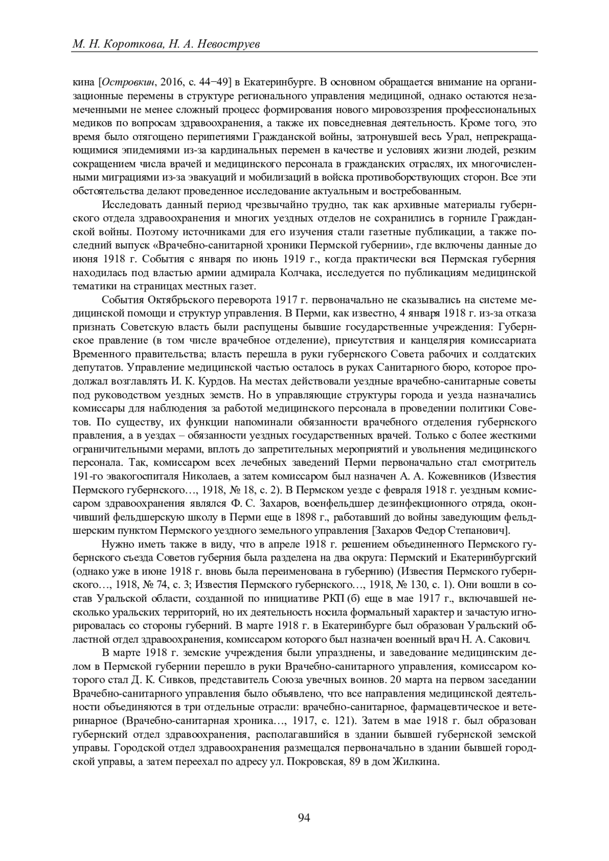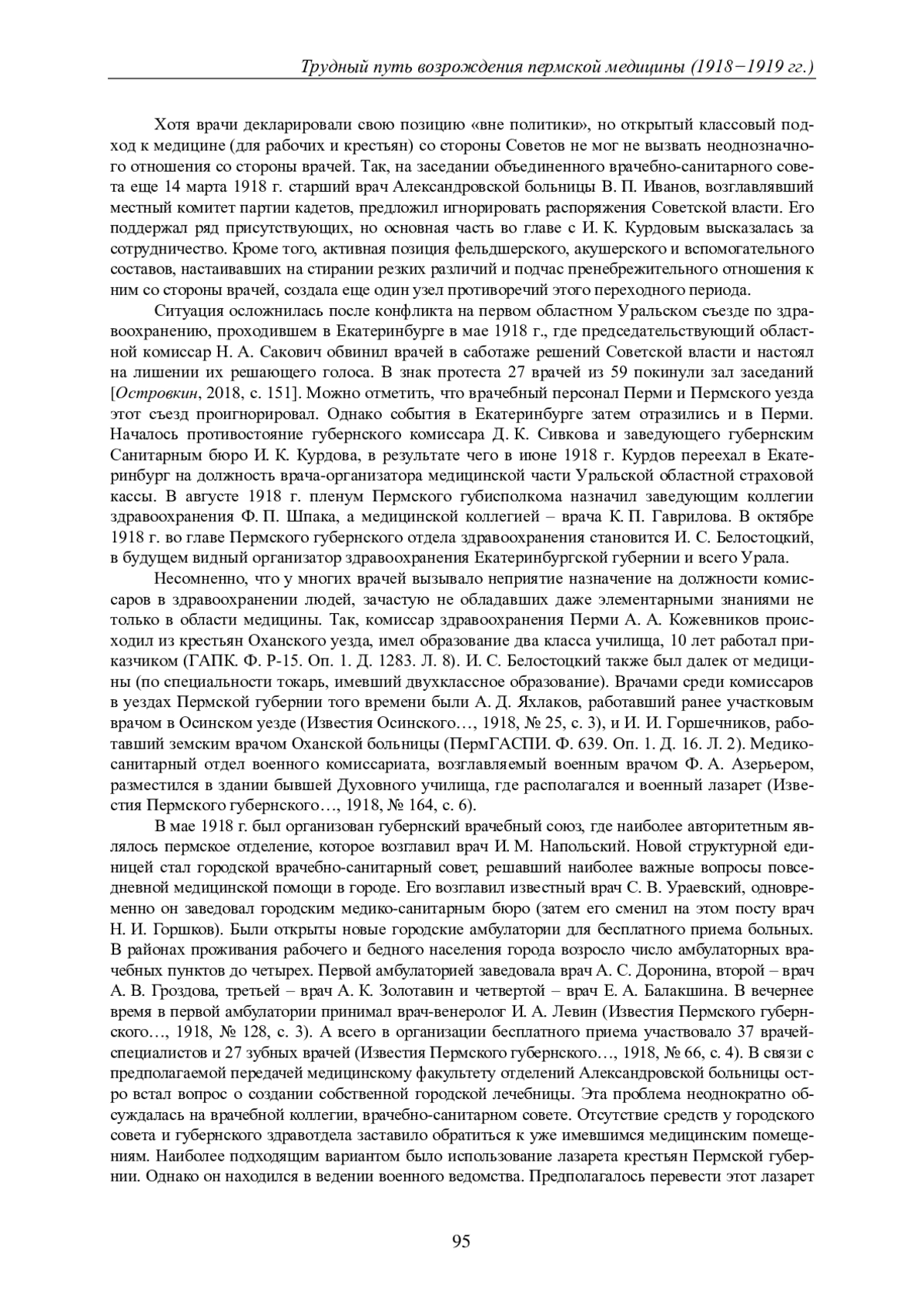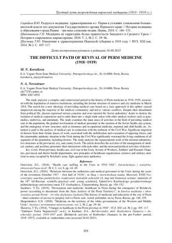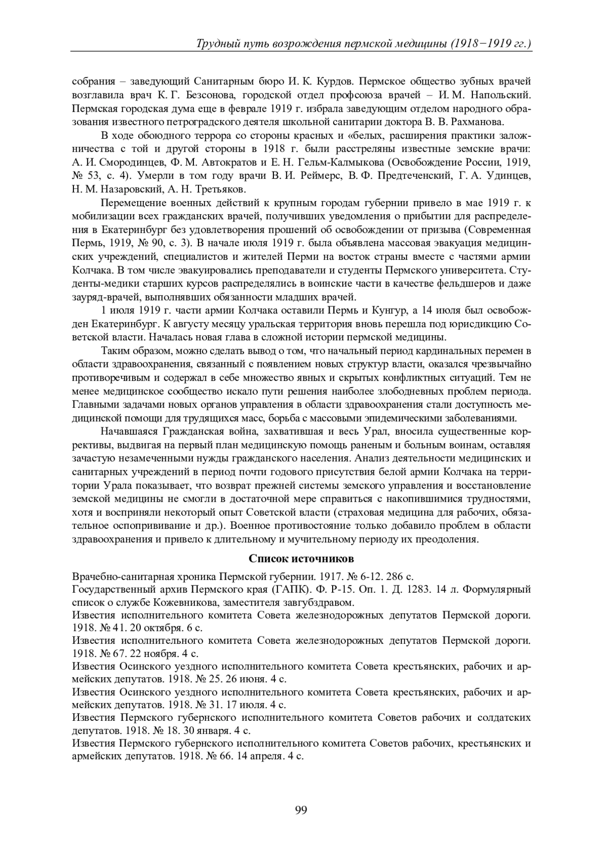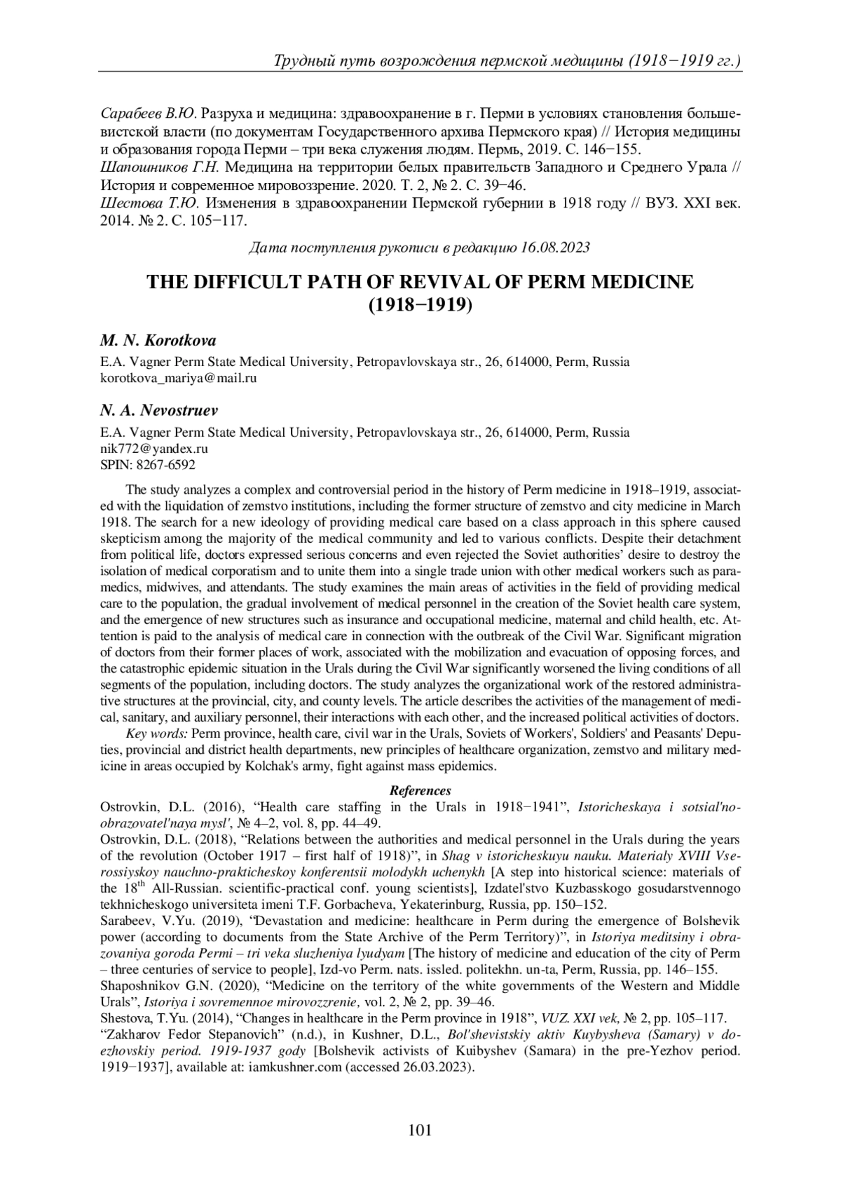 4. Сарабеев В.Ю. Разруха и медицина: здравоохранение в г. Перми в условиях становления большевистской власти (по документам Государственного архива Пермского края) // История медицины и образования города Перми - три века служения людям. Пермь, 2019. С. 146-155. EDN: OFIVCO