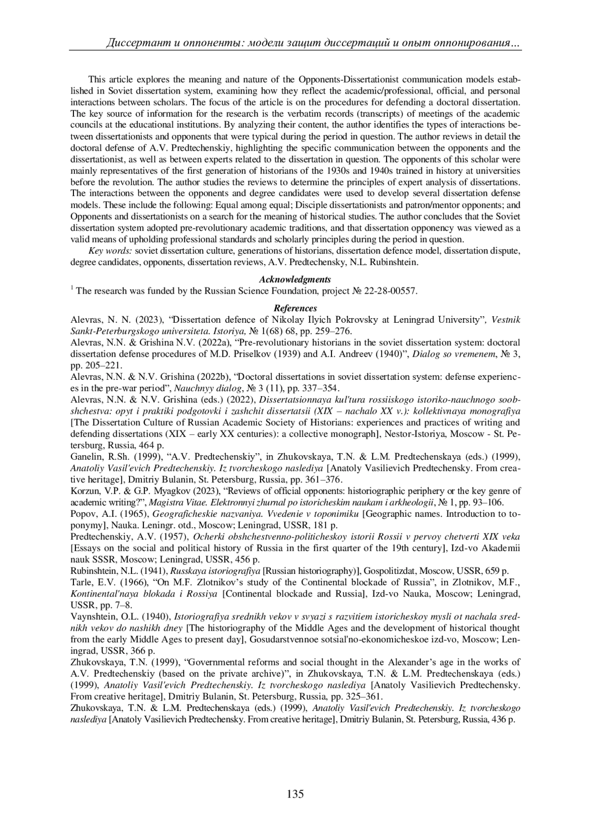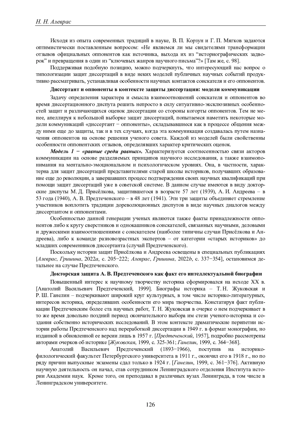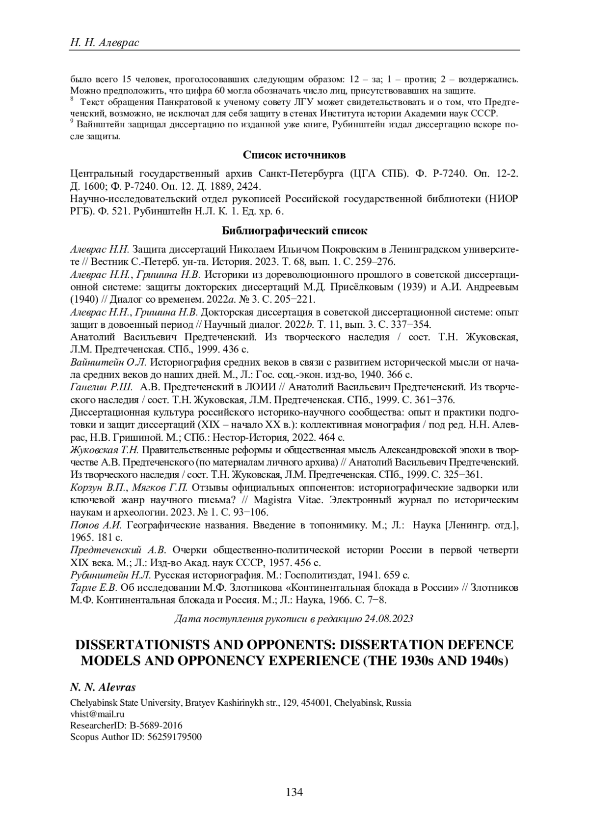 3. 	Алеврас Н.Н., Гришина Н.В. Докторская диссертация в советской диссертационной системе: опыт защит в довоенный период // Научный диалог. 2022b. Т. 11, вып. 3. С. 337-354. EDN: ONOJZE