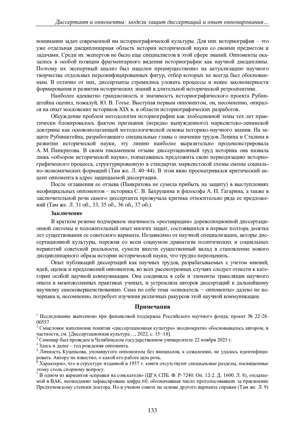 Раскрываются смысл и характер формировавшихся коммуникационных моделей «диссертант - оппоненты» в советской диссертационной системе, которые идентифицируются как выражение научно-профессионального, официально-делового и личностно-дружеского взаимодействия людей науки. В поле внимания находятся преимущественно докторские защиты. Основным источником информации являются стенографические отчеты (стенограммы) заседаний ученых советов соответствующих образовательных институций. Анализ их содержания позволил представить характерные для изучаемого времени типы взаимодействия диссертантов и оппонентов, положенные в основу моделей защит диссертаций. В центр специального внимания поставлена докторская защита А. В. Предтеченского, имевшая свои особенности коммуницирования оппонентов с соискателем, а также внутри корпуса экспертов. Оппонентами ученого являлись в основном представители первого поколения историков 1930-1940-х гг., получивших историко-научную подготовку в дореволюционных университетах. Исследованы тексты их отзывов с целью определения принципов экспертного анализа диссертационного труда. Особенности взаимодействия оппонентов и соискателей ученых степеней стали основой разработки моделей защит диссертаций: «равные среди равных», «диссертанты-ученики, оппоненты-патроны/наставники», «диссертант-новатор, оппоненты-традиционалисты». Сделаны выводы о рецепции советской диссертационной системой дореволюционных научных традиций. Культура оппонирования диссертаций трактуется как соответствовавшая профессиональным нормам и принципам научности изучаемого времени.