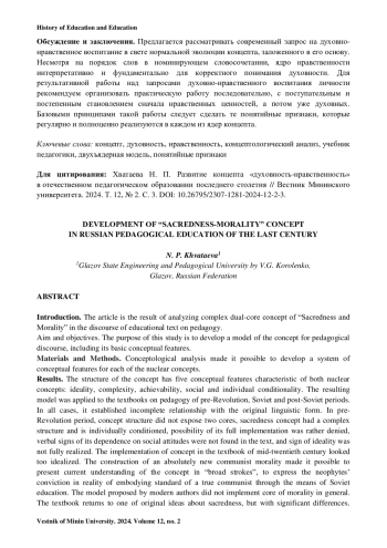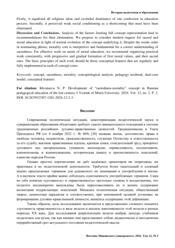 Введение. Статья представляет собой результат анализа сложного двухъядерного концепта «духовность-нравственность» в дискурсе учебного текста по педагогике. Целью данного исследования было рассмотрение динамики модели концепта для педагогического дискурса ХХ века, включающей базовые для него понятийные признаки. Сами по себе понятия «духовность» и «нравственность» настолько сложны и неоднозначны, что педагоги неоднократно вынуждены были переосмысливать их и менять содержание воспитания подрастающих поколений.