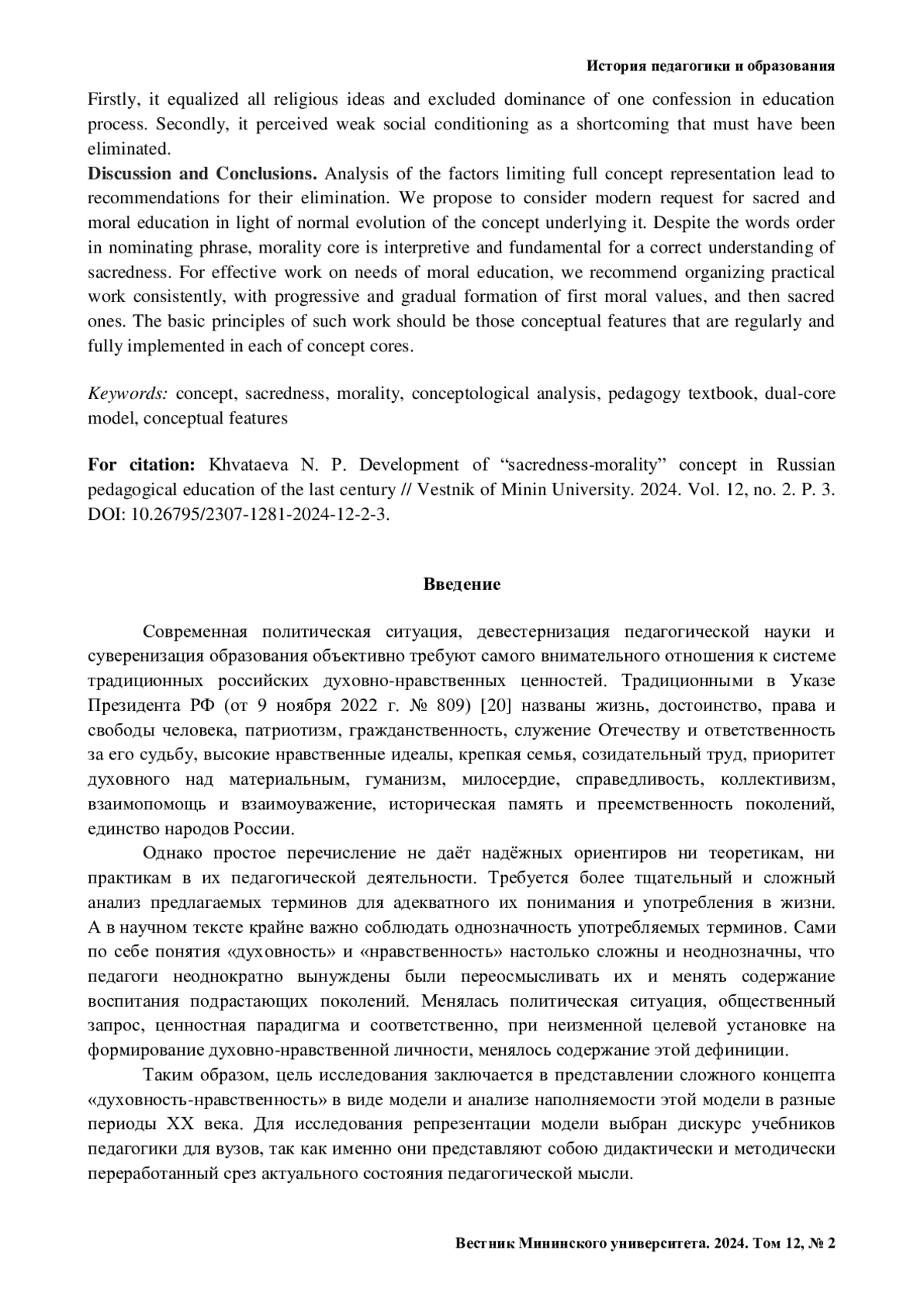 Обсуждение и заключения. Предлагается рассматривать современный запрос на духовнонравственное воспитание в свете нормальной эволюции концепта, заложенного в его основу. Несмотря на порядок слов в номинирующем словосочетании, ядро нравственности интерпретативно и фундаментально для корректного понимания духовности. Для результативной работы над запросами духовно-нравственного воспитания личности рекомендуем организовать практическую работу последовательно, с поступательным и постепенным становлением сначала нравственных ценностей, а потом уже духовных. Базовыми принципами такой работы следует сделать те понятийные признаки, которые регулярно и полноценно реализуются в каждом из ядер концепта.