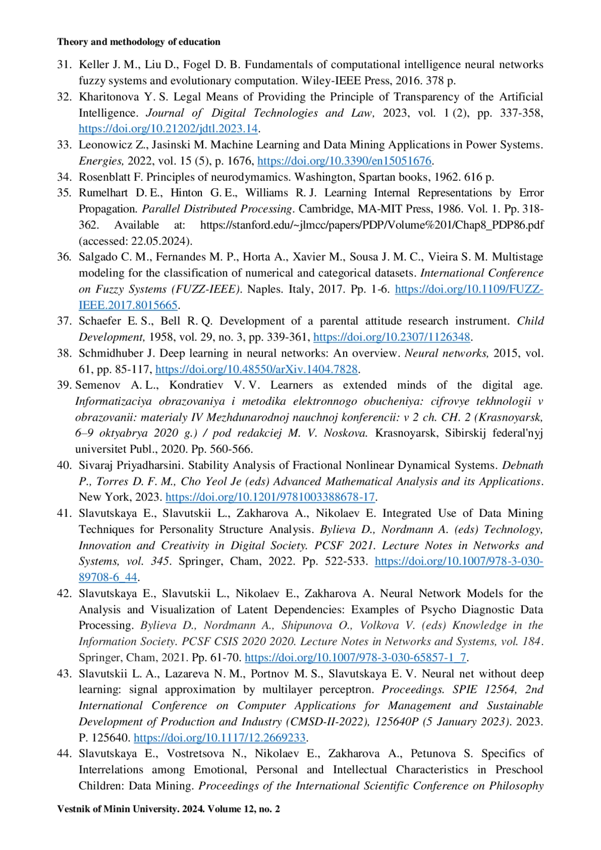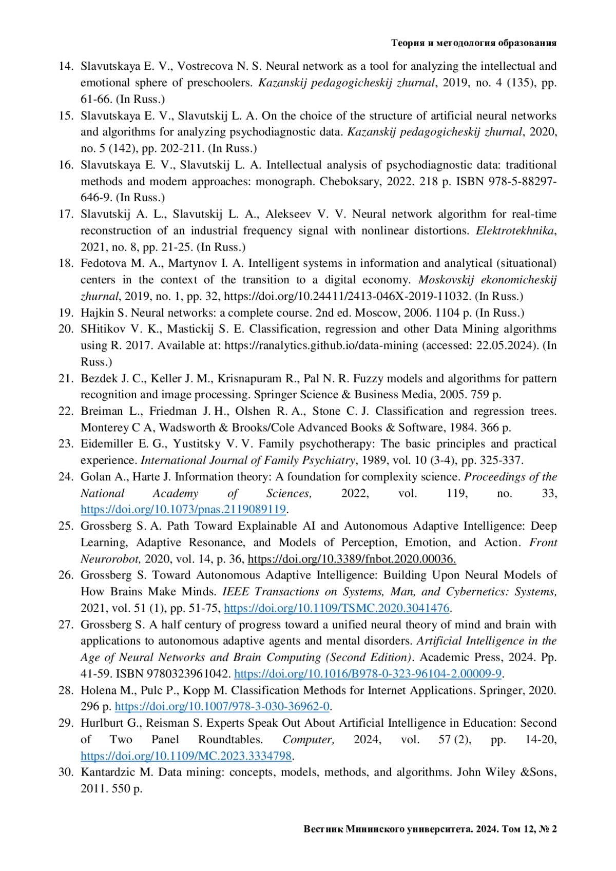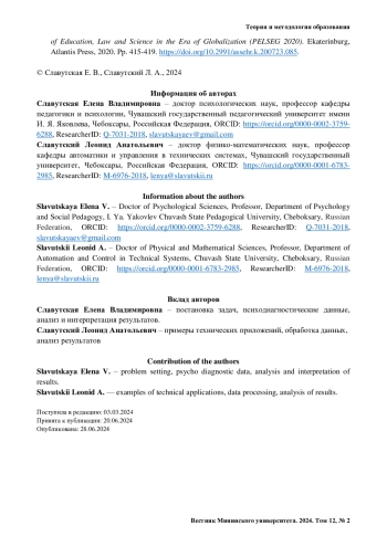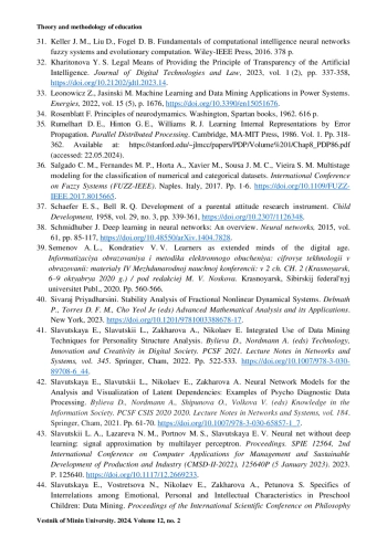 15. Славутская Е. В., Славутский Л. А. О выборе структуры искусственных нейросетей и алгоритмов анализа психодиагностических данных // Казанский педагогический журнал. 2020. № 5 (142). С. 202-211.