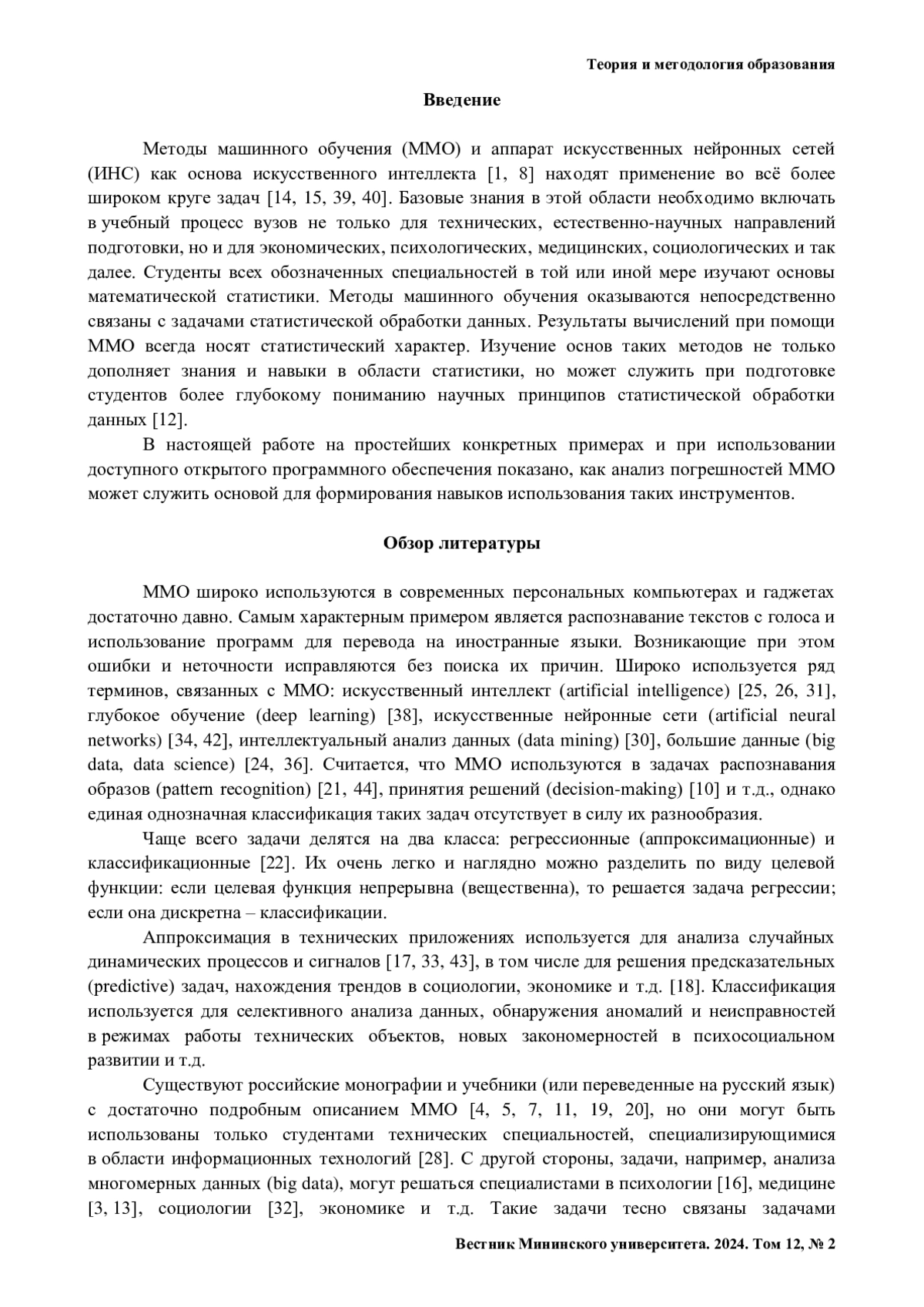 Введение. Методы машинного обучения и элементы искусственного интеллекта используются для анализа случайных данных, процессов и сигналов. Изучение соответствующих инструментов уже входит в учебные программы направлений подготовки разного уровня.