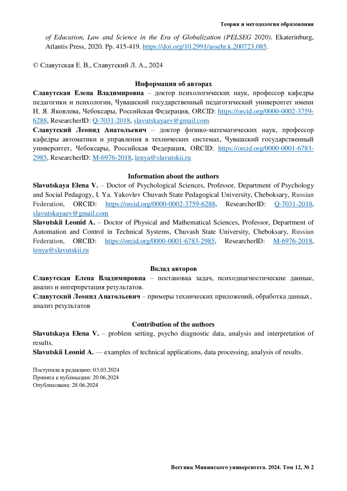 44. Slavutskaya E., Vostretsova N., Nikolaev E., Zakharova A., Petunova S. Specifics of Interrelations among Emotional, Personal and Intellectual Characteristics in Preschool Children: Data Mining // Proceedings of the International Scientific Conference on Philosophy of Education, Law and Science in the Era of Globalization (PELSEG 2020). Ekaterinburg: Atlantis Press, 2020. Pp. 415-419. https://doi.org/10.2991/assehr.k.200723.085.